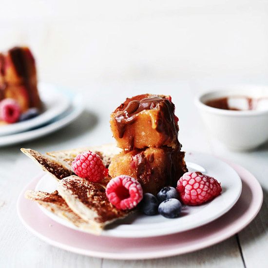 Take tropical fruit and turn it into a smoothie. Freeze and add a tortilla waffle and chocolate sauce to create this tortilla tropical ice cream sundae.