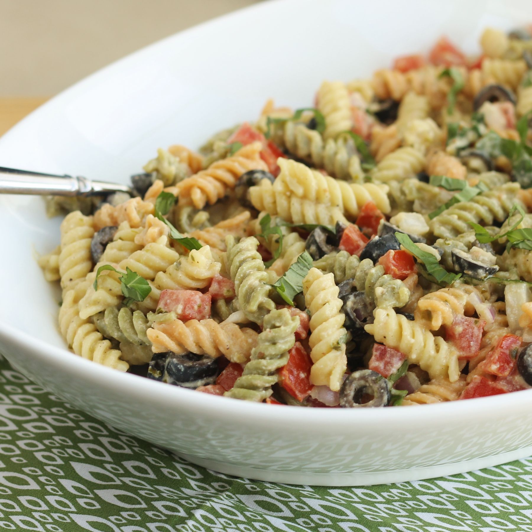 A simple pasta salad with an Italian fare, made up of Casear dressing, pesto, olives, tomatoes and fresh basil.