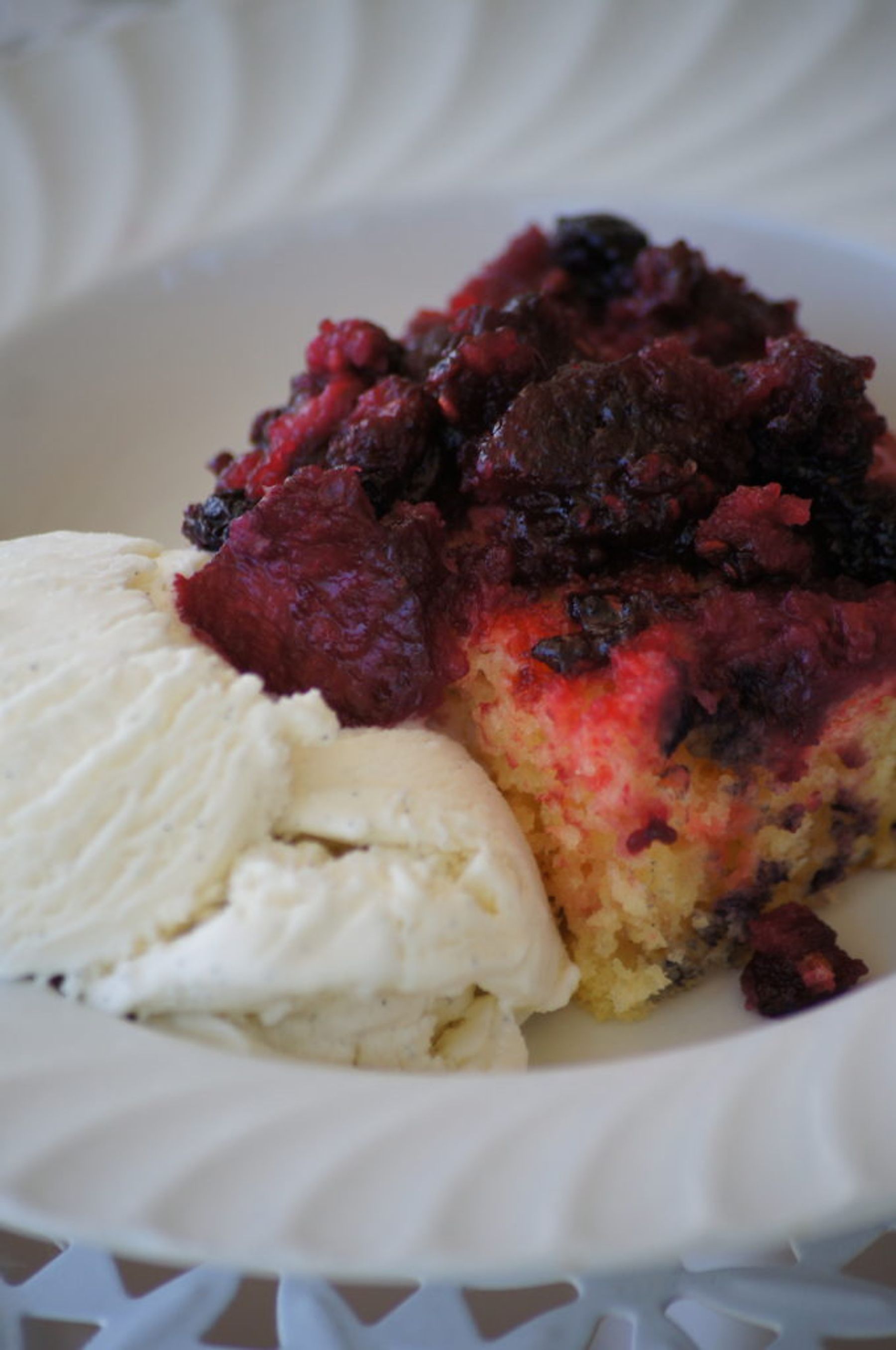 Spray a 12\\\" cast iron fry pan or line it with parchment. Add the berries and top with sugar and Jello powder. In a separate bowl, combine cake mix, eggs, water and oil. Mix well and then add the...
