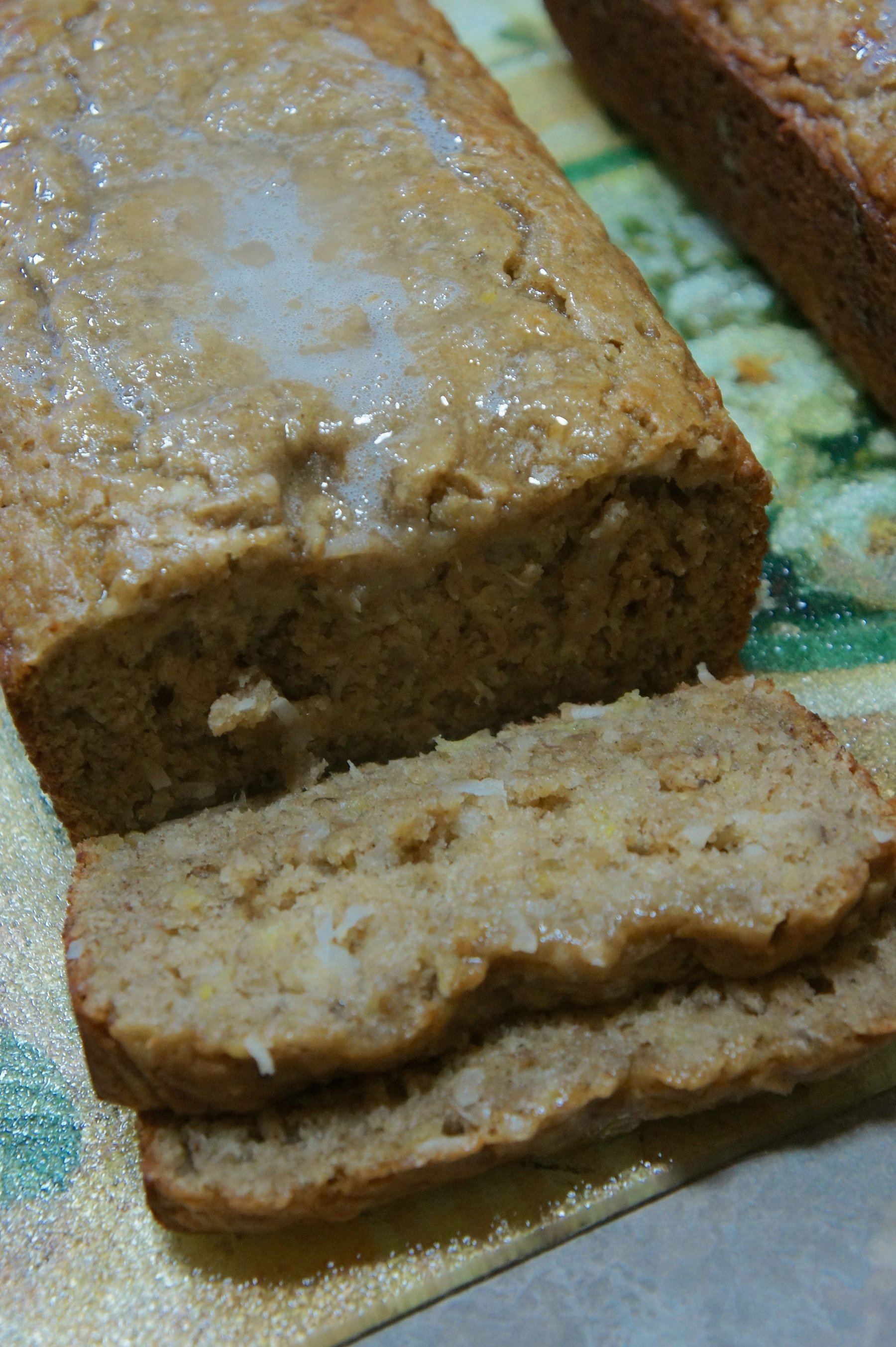 A banana bread made with applesauce, pineapple and coconut.