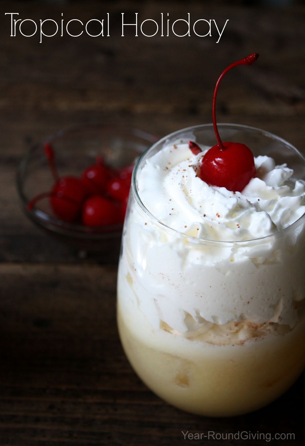 It has cream of coconut, pineapple juice and orange juice. Pretty tropical right? Then there is the whip cream, nutmeg, and spiced rum that gives this cocktail a holiday flavor.
