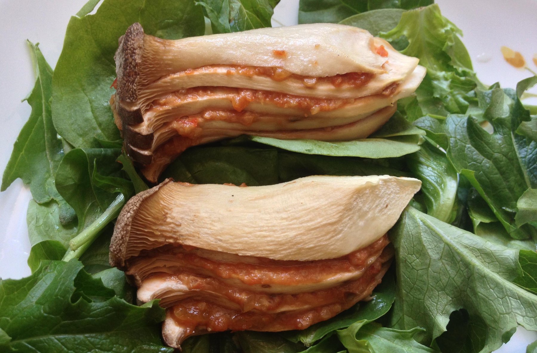 Place the bottom slice of each trumpet mushroom in the baking dish, leaving about 1 inch between them. Put a little sauce on each slice, then cover with the second layer of each mushroom. Repeat in this fashion until all the slices are used up for each mushroom.
