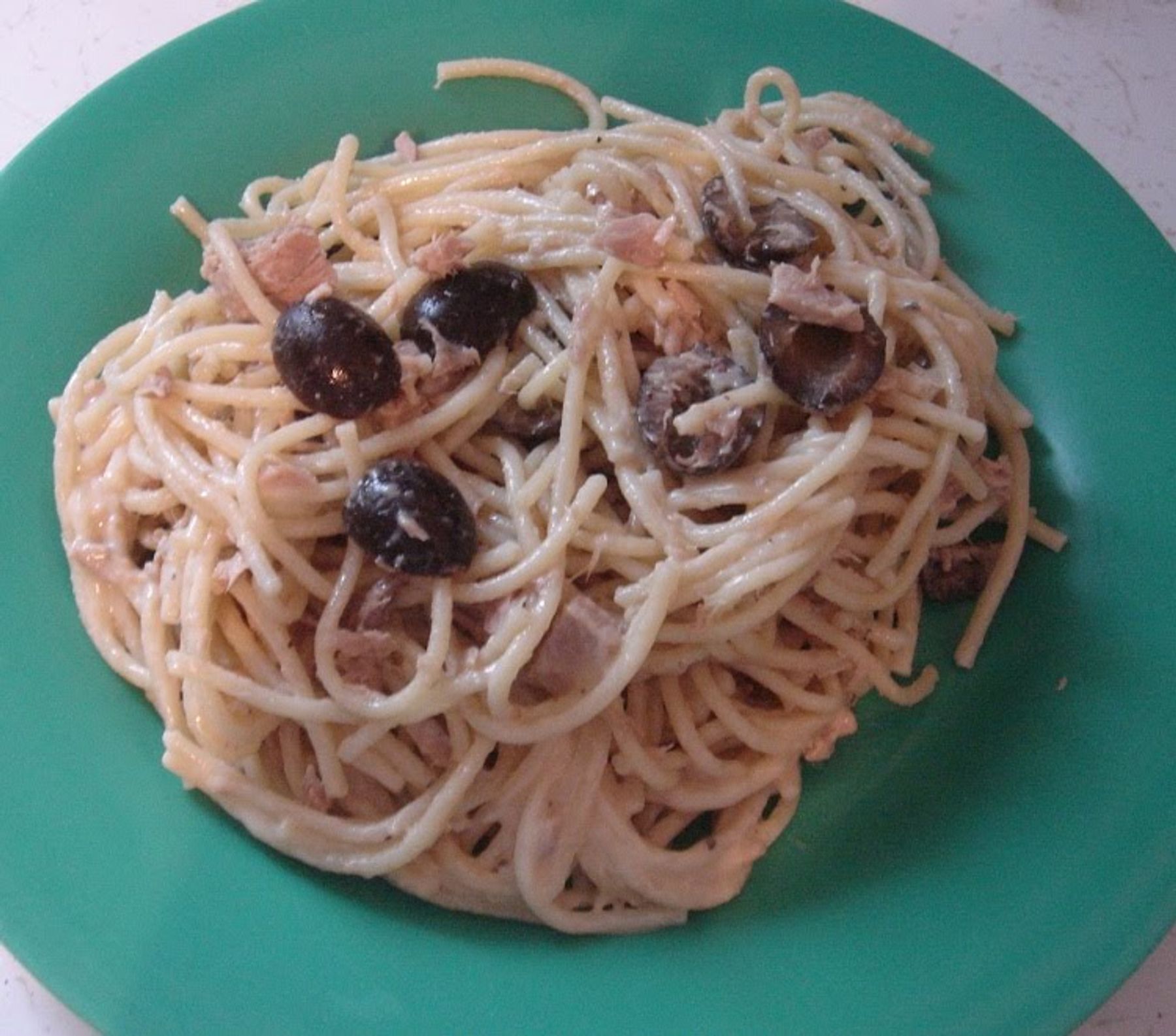Cook the spaghetti and add as much tuna as you like. Same with black olives. Then toss with dressing. My son and I prefer Newman’s Own Creamy Caesar Salad Dressing. We’ve tried other Caesar dressings, but...