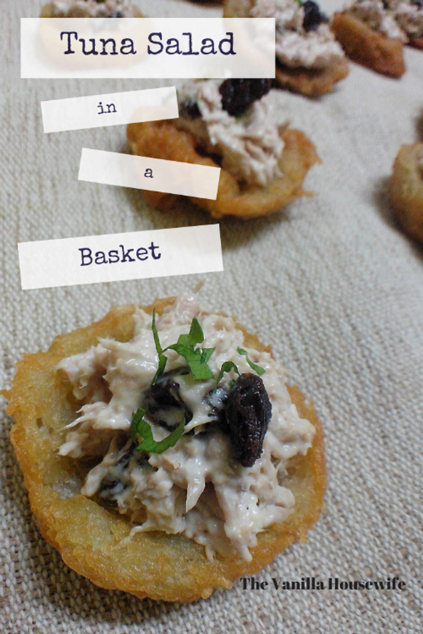 In a bowl, mix shredded tuna, mayonnaise, onions, cheese, raisins in a bowl. Add salt and pepper to taste. Then chill in the fridge until baskets are ready.