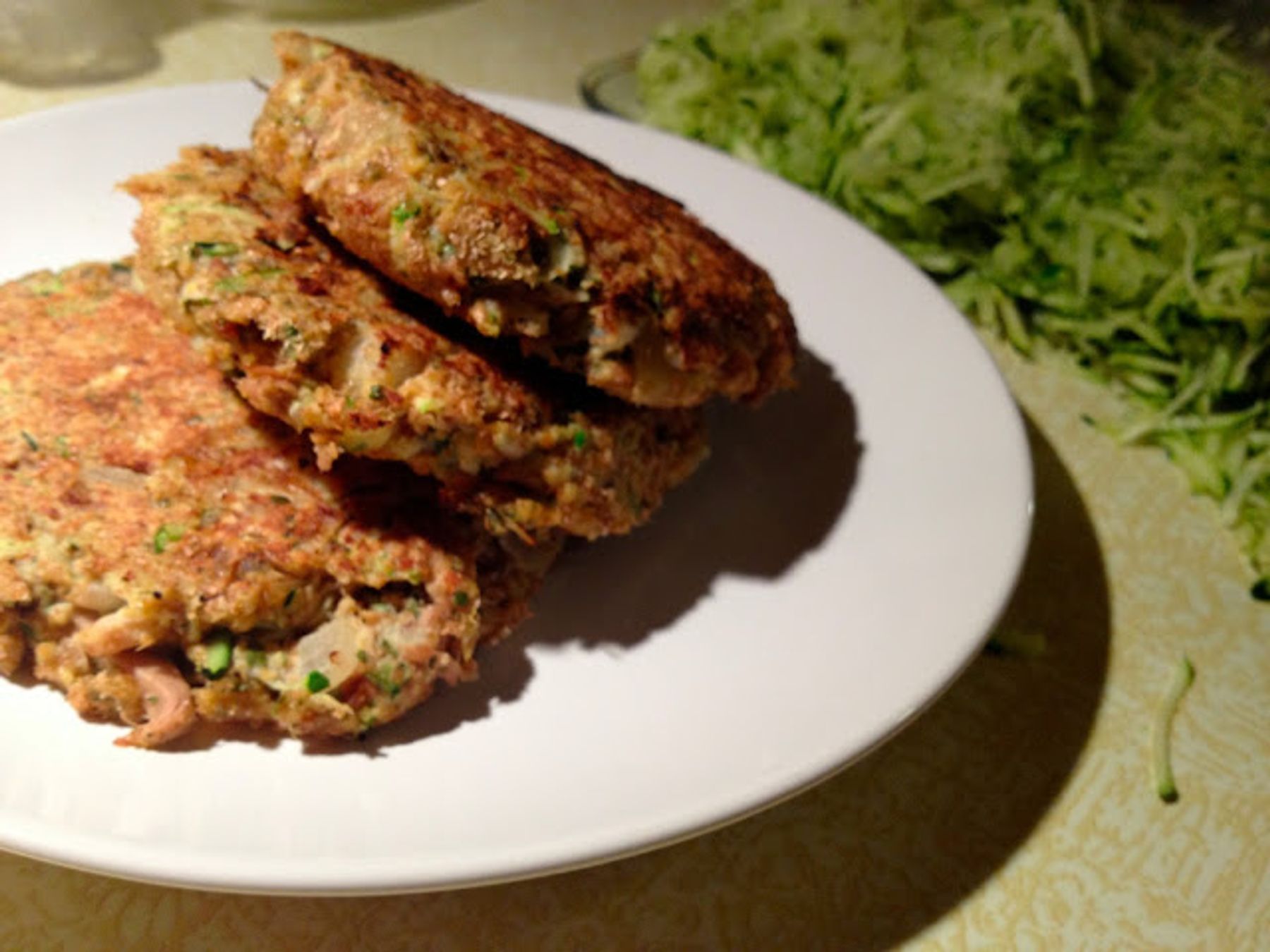 In a large saucepan, heat the butter over medium-high heat. Add the onion & cook until tender. Remove from heat. Add the tuna, 1/2 cup bread crumbs or wheat germ, zucchini, eggs, parsley, lemon juice, salt...