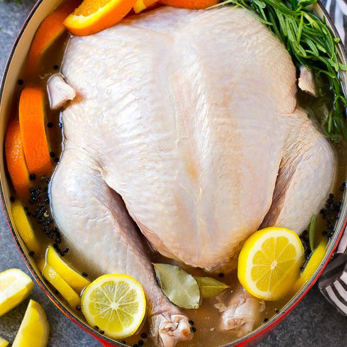 This turkey brine recipe is flavored with apple, citrus, brown sugar, rosemary and spices. It's the perfect way to guarantee a moist and flavorful turkey every time!