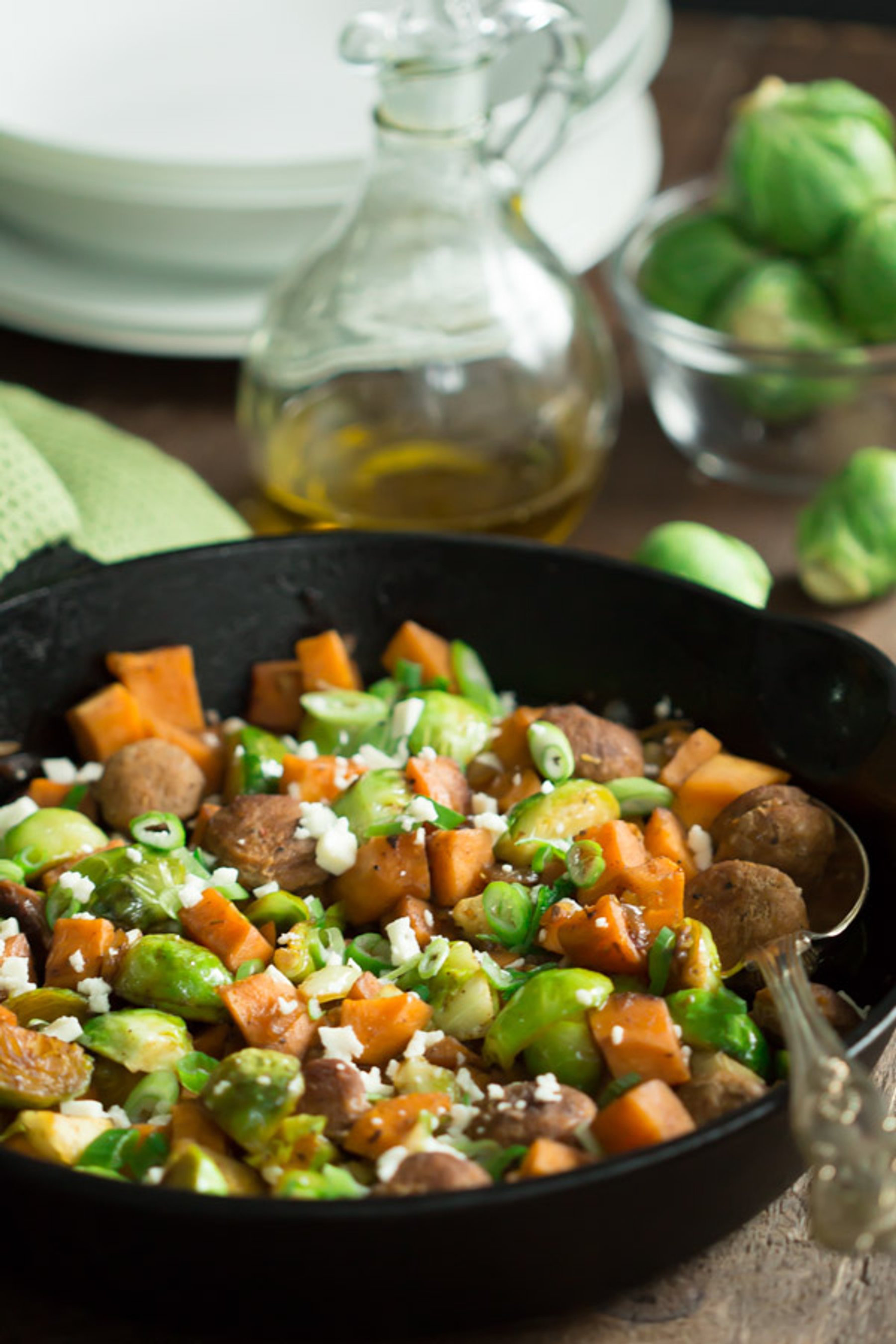 Turkey Sausage Skillet with Brussel Sprouts and Sweet Potatoes