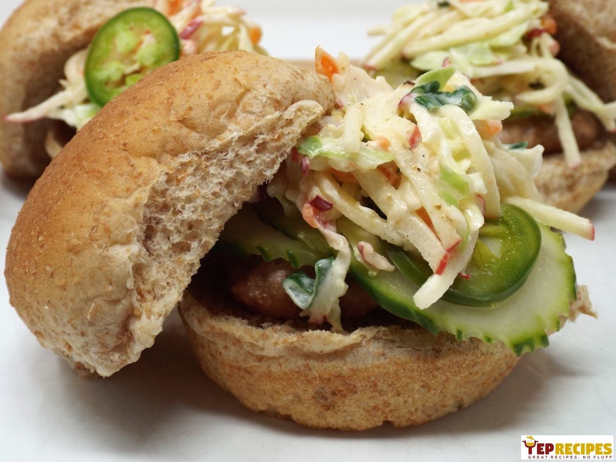 These little turkey burgers are topped with apple-coleslaw and quick sweet and sour pickles.
