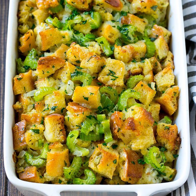 This turkey stuffing is a classic recipe with bread, sauteed vegetables, butter and fresh herbs, all baked together to golden brown perfection. The perfect side dish for Thanksgiving that can be assembled the day before the big meal.