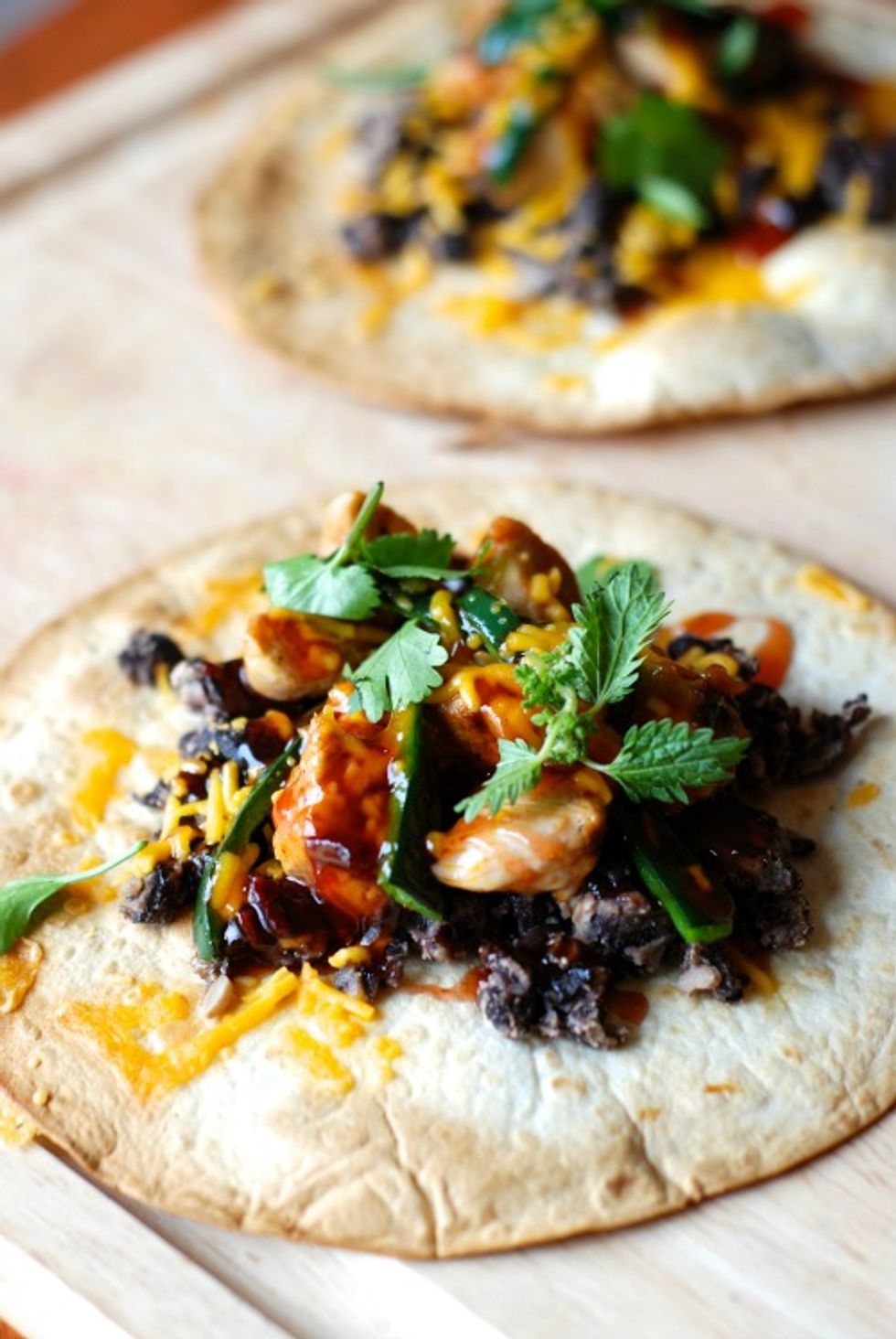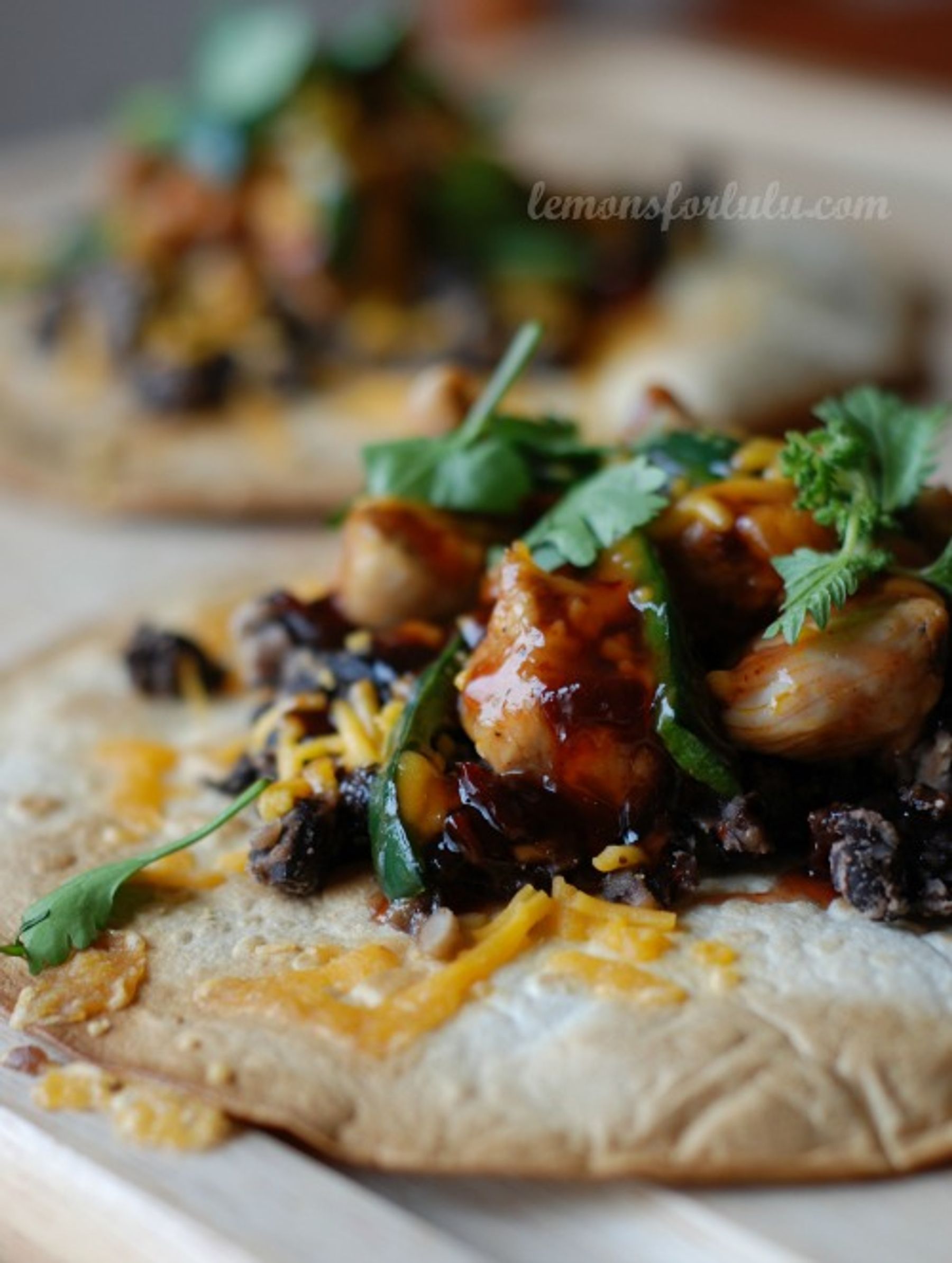 Turkey tostada with black beans, poblano peppers and a spicy sweet raspberry chipotle sauce!