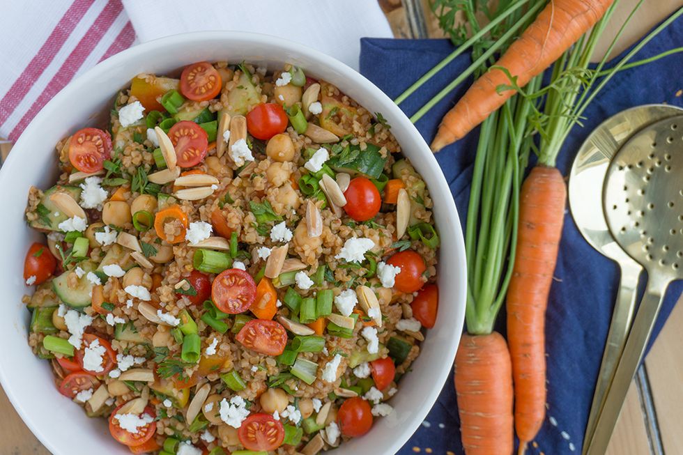 This cold Turkish Bulgur Wheat Salad features the freshest summer garden vegetables – tomatoes, cucumbers and carrots. Tossed with a tangy pomegranate molasses dressing, toasted almonds and sprinkle of feta, this salad will have you enjoying your evening without standing over a hot stove.