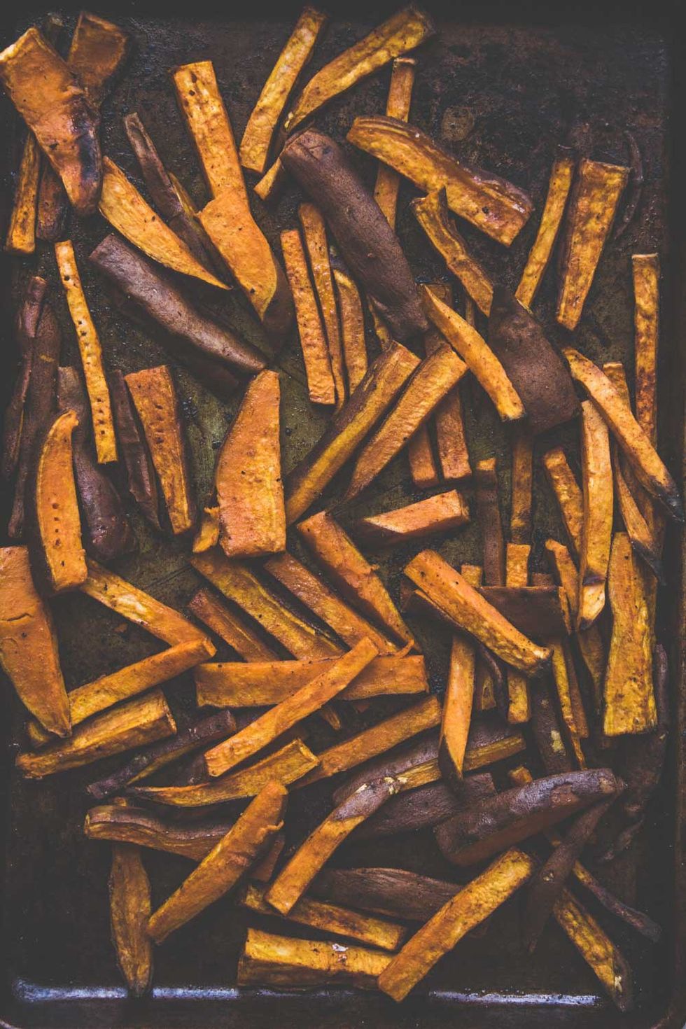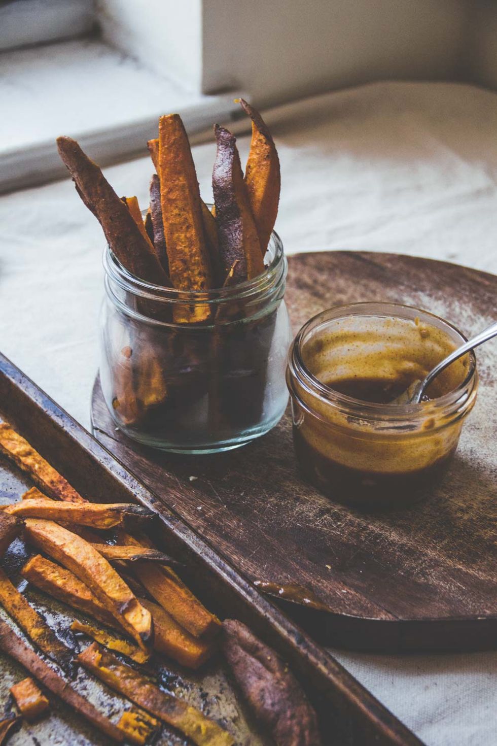 These smoky and spicy baked sweet potato wedges are a great and healthy snack and the smoky tahini dip is absolutely delicious! And just look at that color!