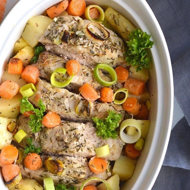 Turmeric Spiced Pork Loin with parsnips, carrots and leeks. Boneless baked pork loin marinated in turmeric, roasted veggies and a sprinkle of herbs. A one-dish Whole30, Paleo, gluten-free meal ready in 30 minutes.