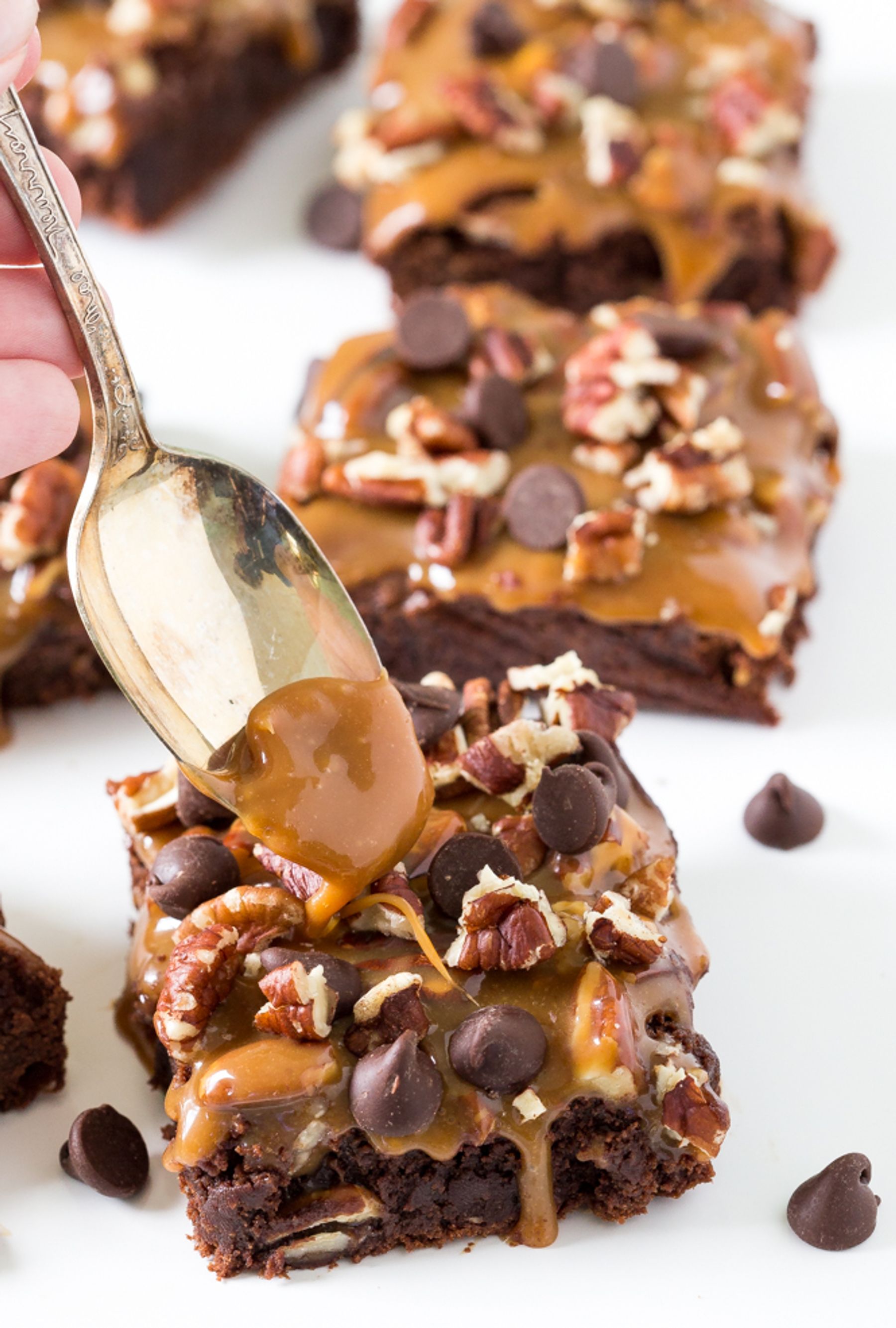Amazing Thick and Fudgey Turtle Brownies layered with caramel sauce, pecans and chocolate chips. A super decadent dessert!