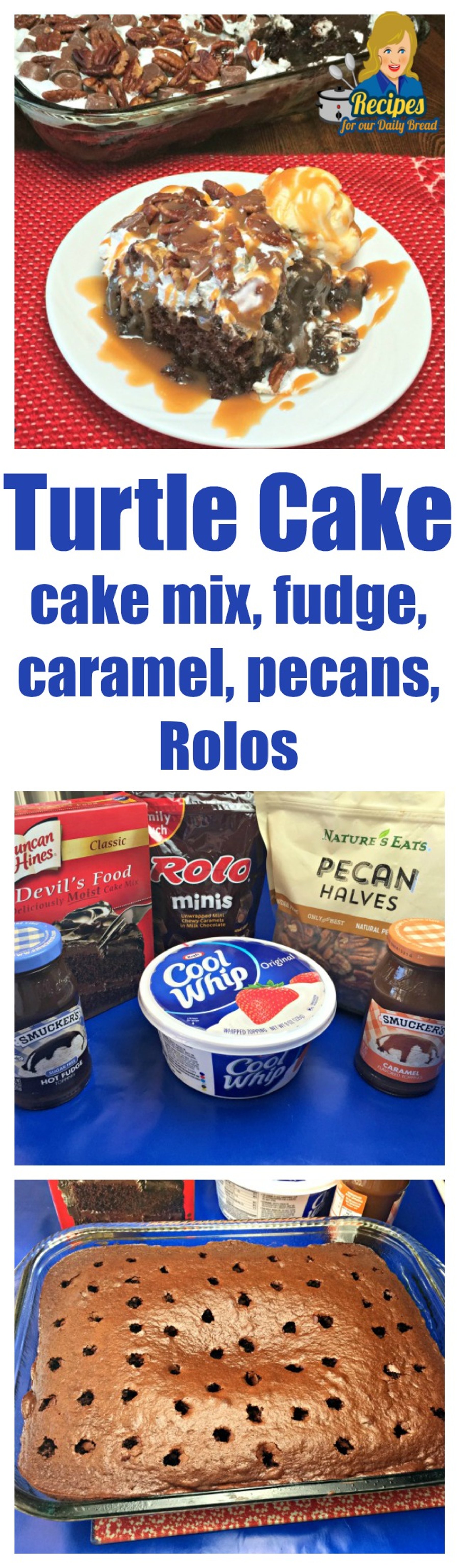 This Turtle Cake is made using a devil’s food cake mix, fudge, caramel, pecans, Cool Whip and Rolo’s. It is easy and delicious.