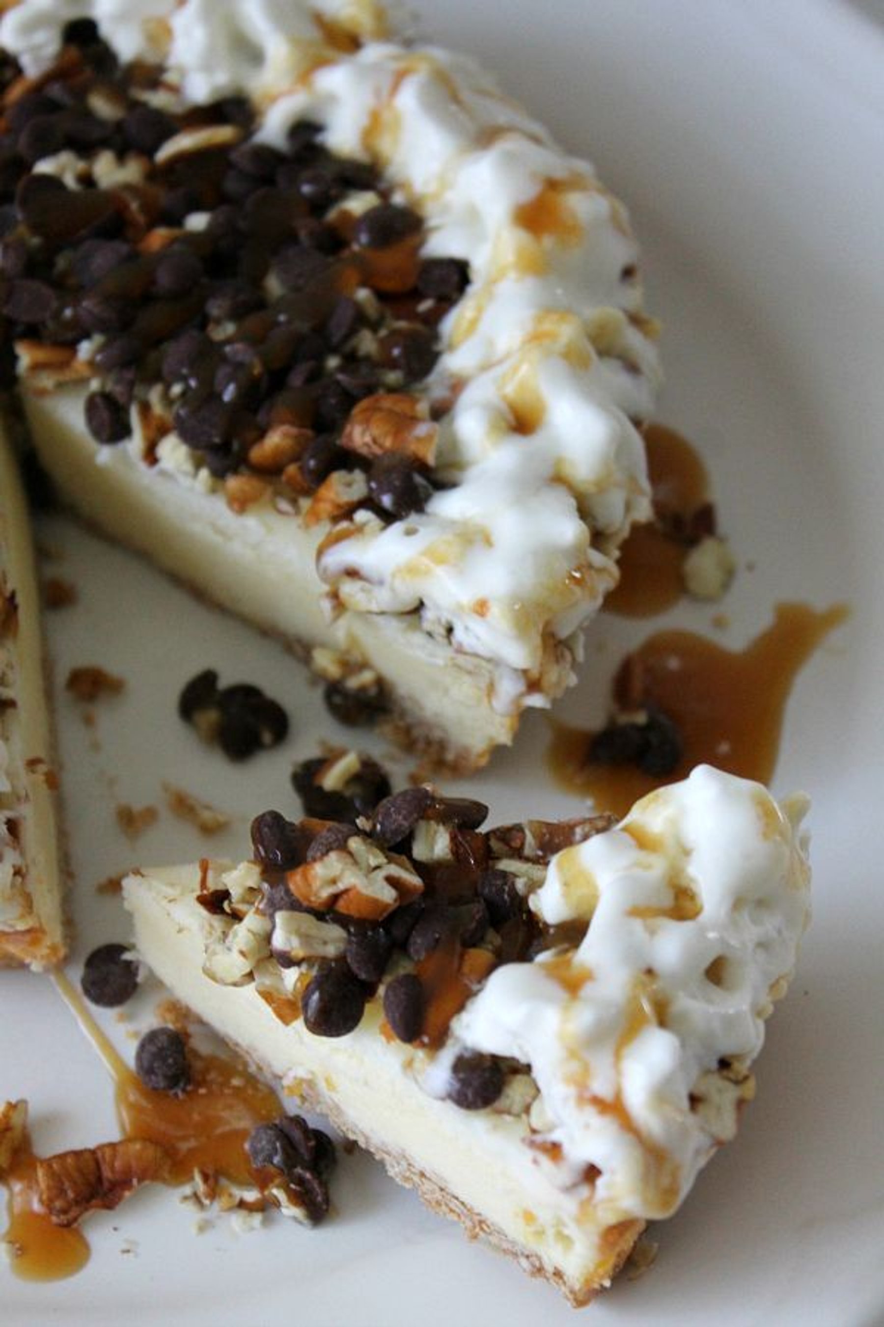 Top cheesecake with pecans and chocolate chips.