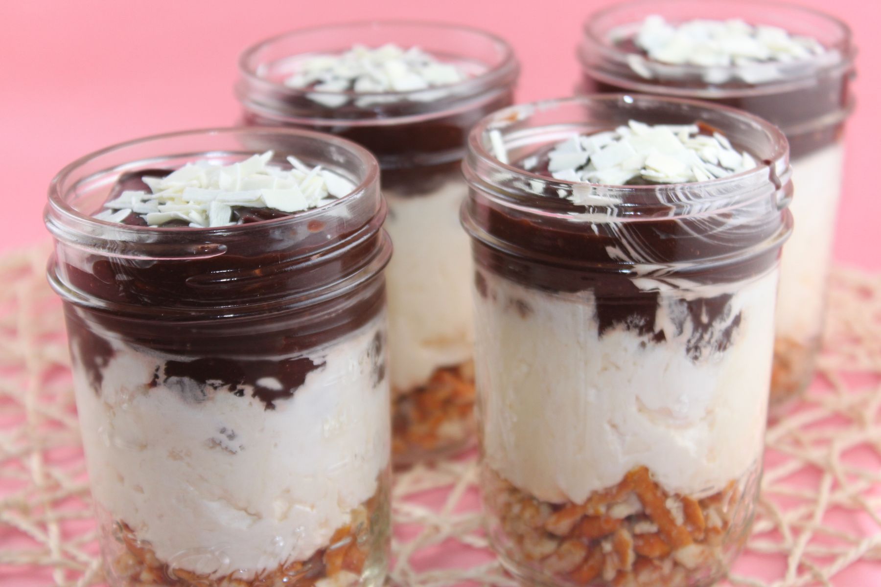 Mix together the pretzels, butter and sugar and spoon into the bottom of 5-6 small jars; set aside.