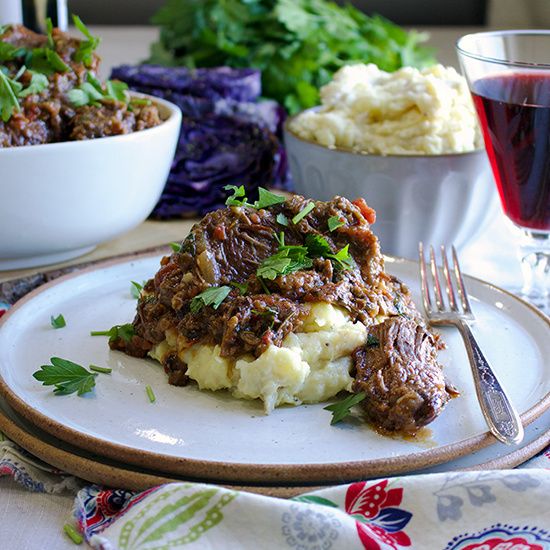 Falling-apart tender beef that's been slow simmered in a wine and vegetable broth and served over garlic mascarpone mashed potatoes. Get the recipe: alittleandalot.com