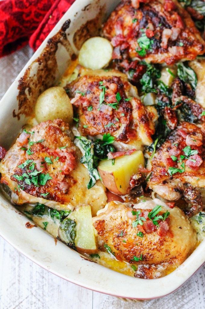 Tuscan Style Chicken and Potatoes is an extremely satisfying dish. Crispy chicken and potatoes with spinach, sun dried tomatoes and bacon bits, all smothered in a creamy Parmesan sauce.