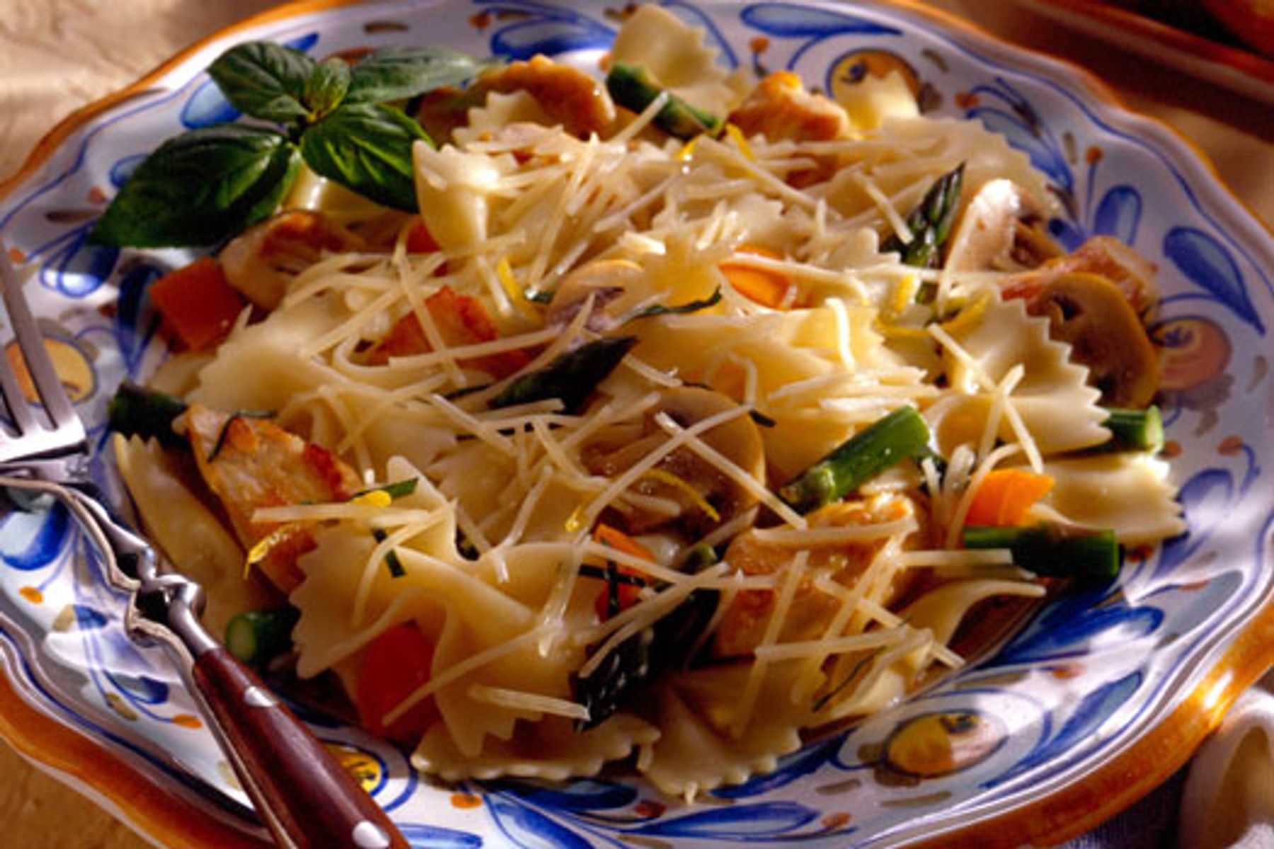 Cook pasta according to package directions. In a large skillet, saute the chicken, zucchini, mushrooms, and pepper in 2 tbsp butter for 4 -5 minutes. Add the lemon juice and broth. Bring to a boil. Reduce heat; cook an stir for 2 minutes or until heated through. Drain pasta; add to skillet. Stir in Parmesan cheese, basil, & remaining butter. Garnish with cheese and serve with a slice of garlic bread.