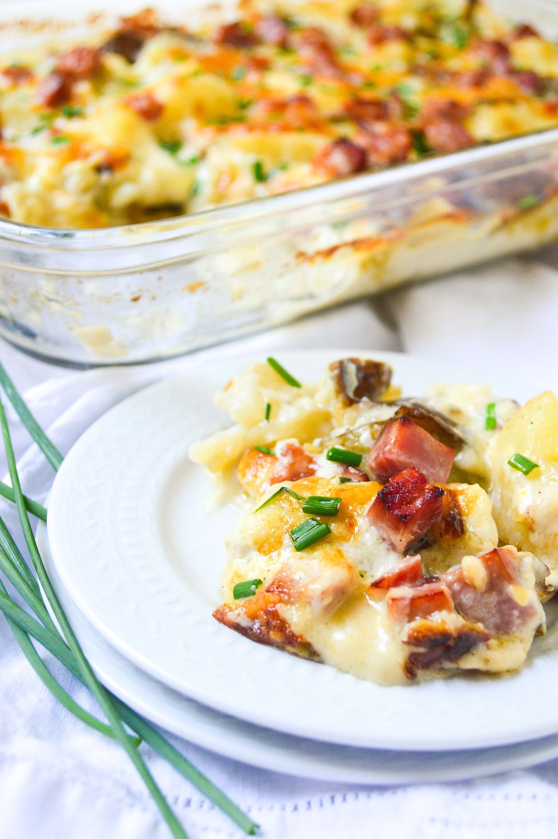 Twice baked scalloped potatoes baked with cubed ham and a rich, creamy sauce, all topped with white cheddar and fresh chives.