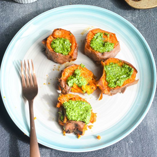 Smashed Sweet Potato with Homemade Garlic Pesto
