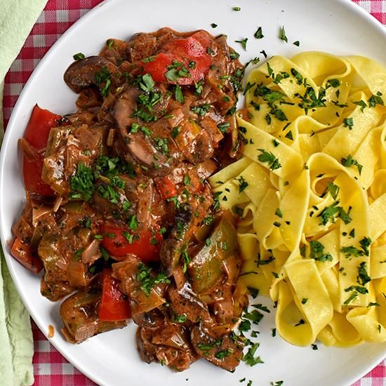 leek, mushroom and pepper stroganoff