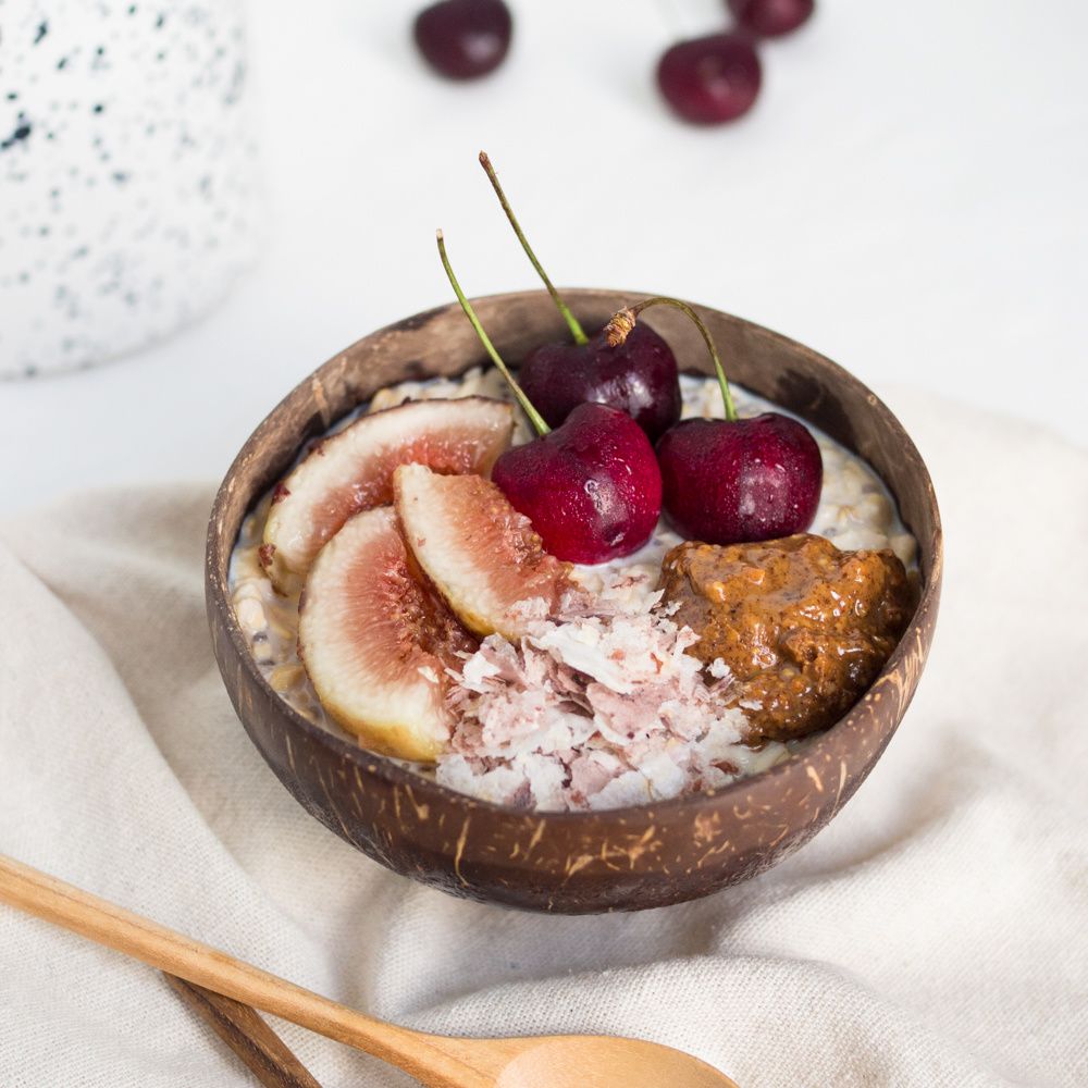 Overnight Oats with Almond Butter, Brown Rice Flakes, Cherries & Fig