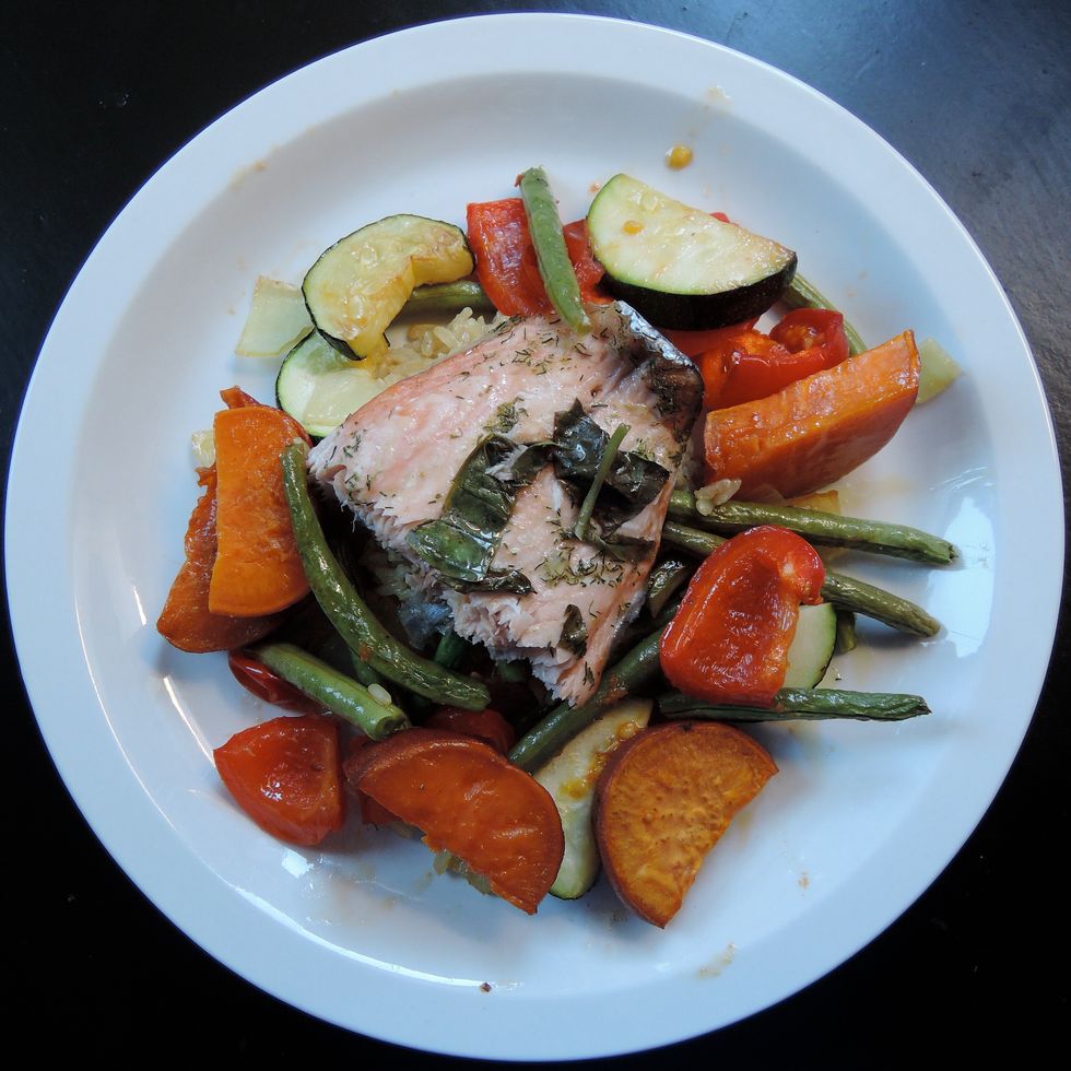 Roasted Herbed Salmon and Vegetables with Brown Rice Pilaf