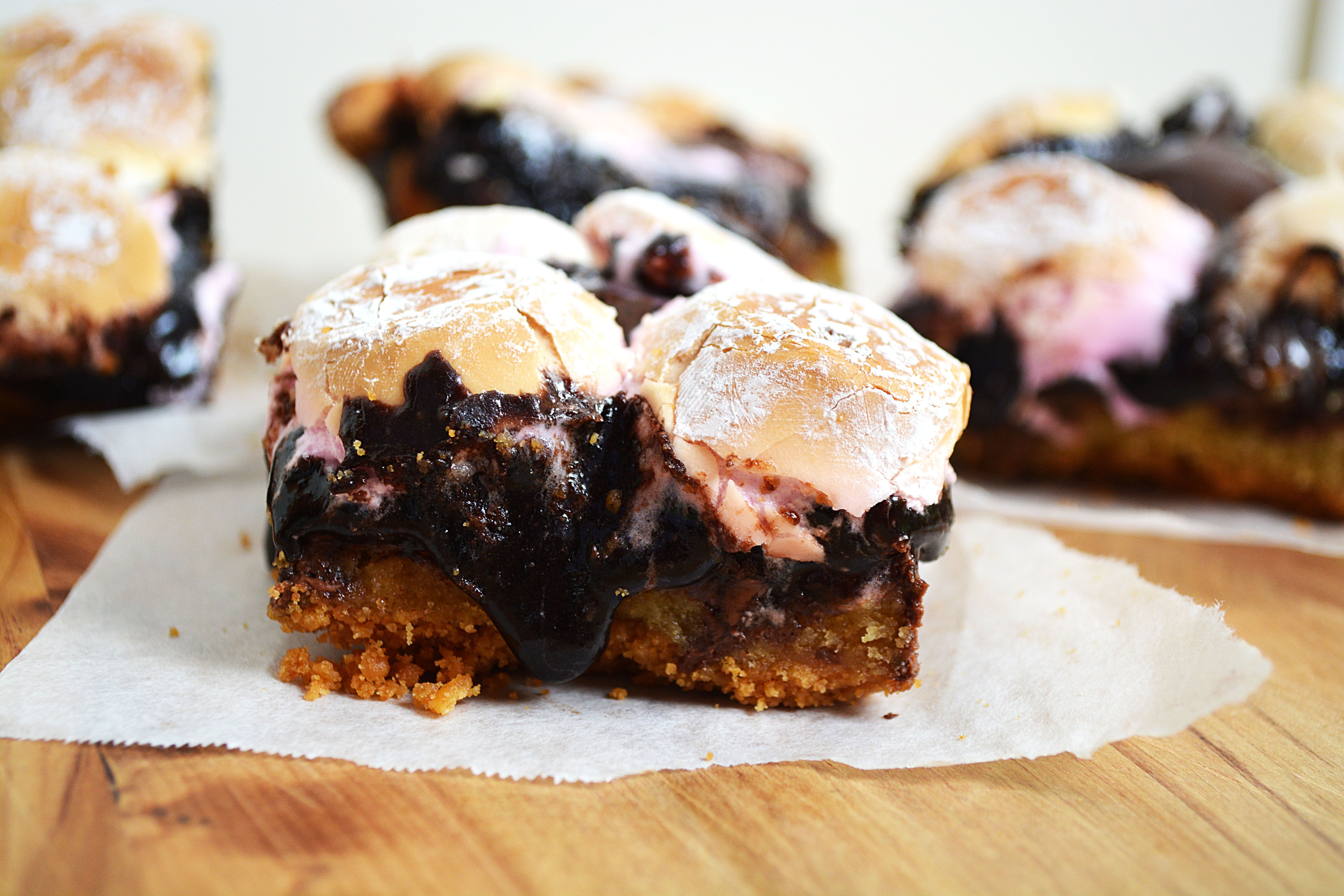 Desserts ​Brookie S'mores Bars are a combination of soft and chewy chocolate chip cookies and rich and fudgy brownies sandwiched in between crushed digestive biscuits (Graham Crackers) and a layer of toasted marshmallows. Emma BurtonDec 07, 2017 156