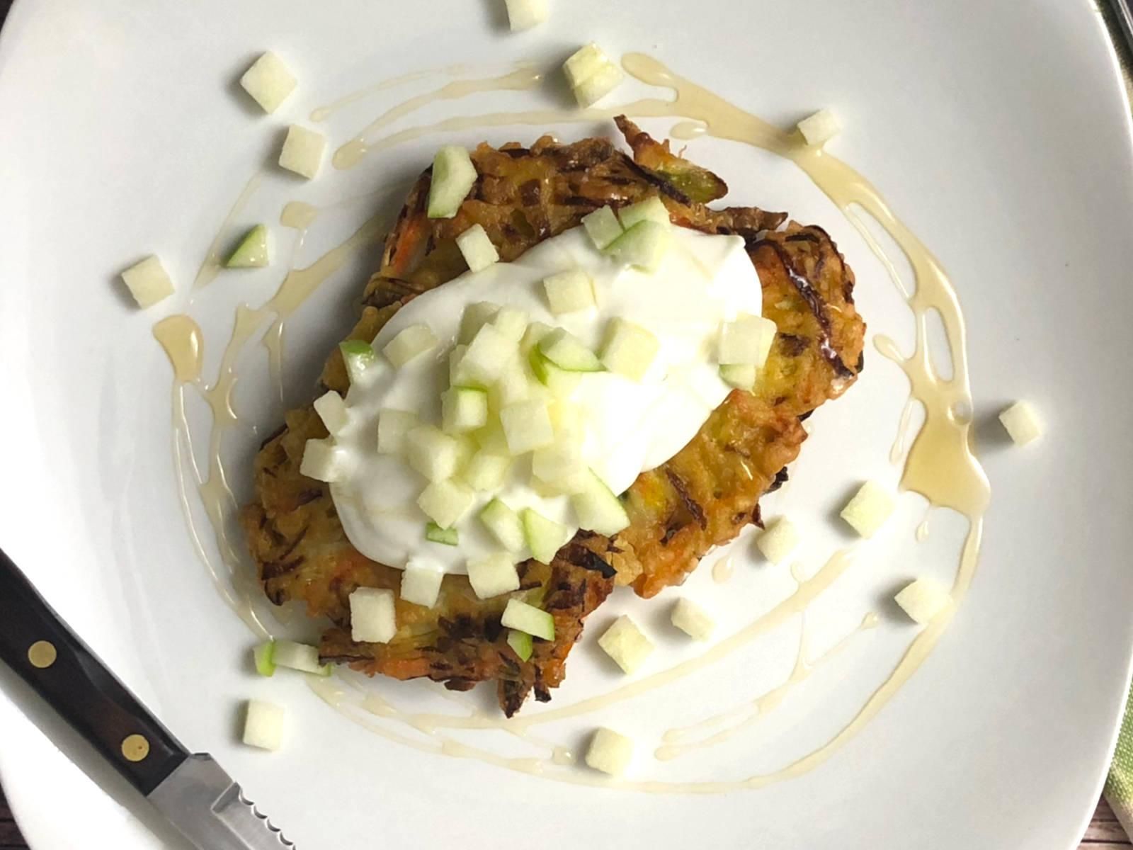 Cabbage Veggie Fritters With Honey Greek Yogurt and Diced Apple