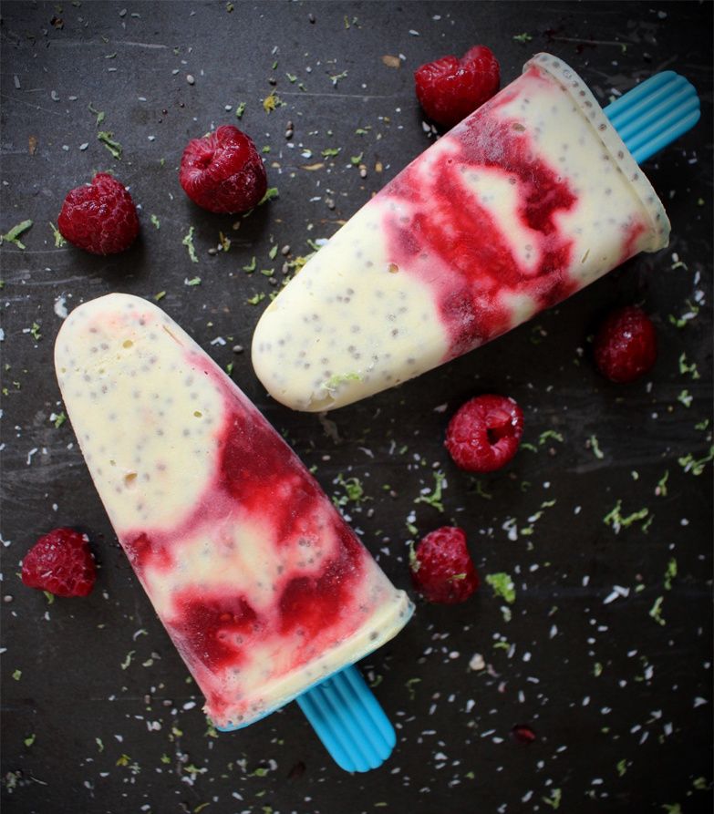 Mango, Coconut and Chia Popsicles with Raspberry Coulis