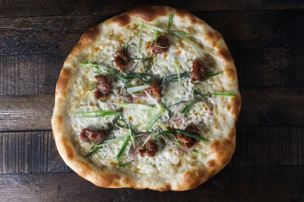 Sausage, Panna, and Scallion Pizza