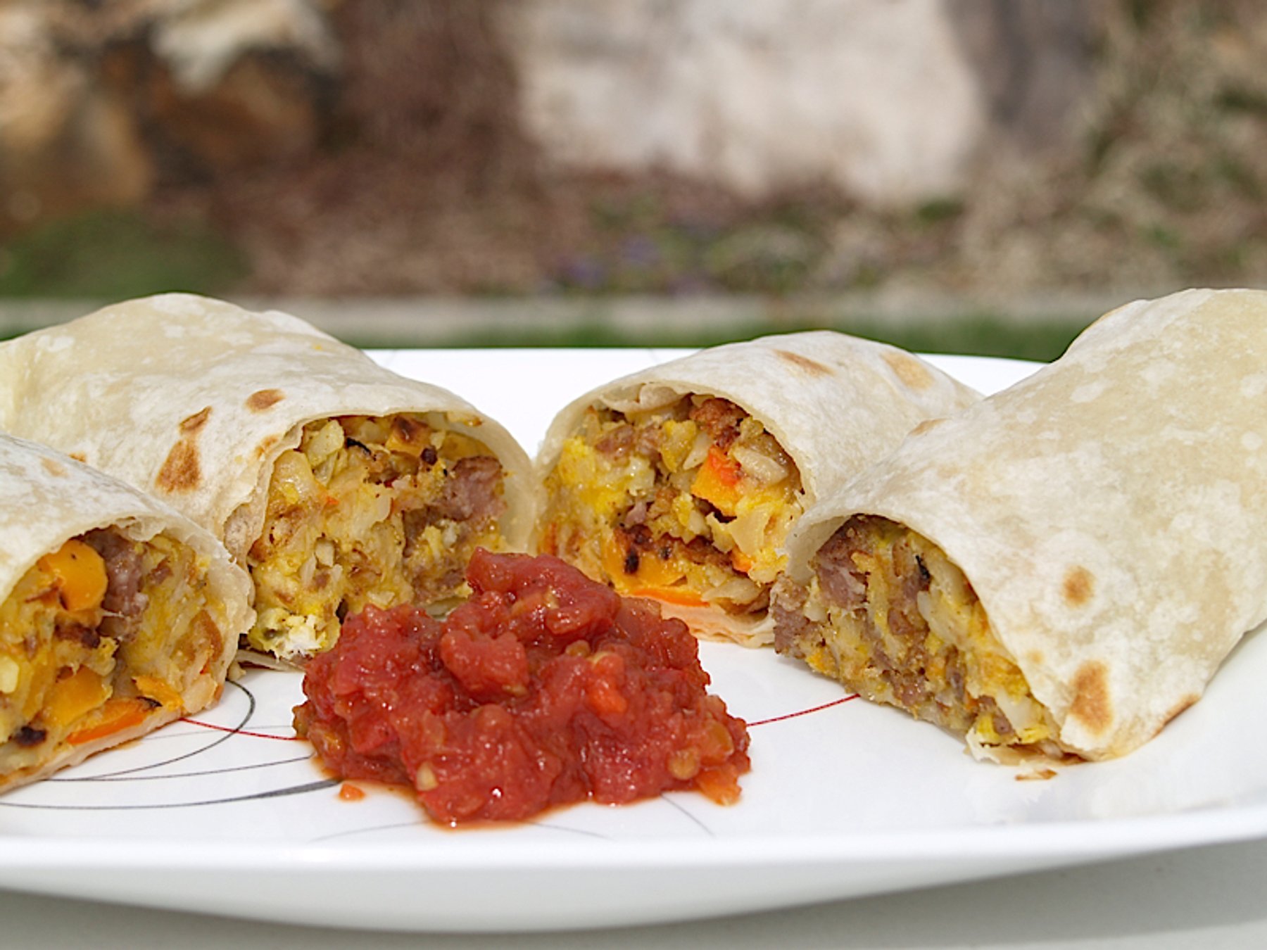 One our favorite breakfasts for camping or any time when we are cooking for a large group is breakfast burritos. What makes these so nice is that you can add any food items that you like to the burrito to tailor them to your taste. I like cooking them on my double grill on the outdoor stove because I have a lot of surface area to use for cooking. This recipe is using fresh vegetables but you can substitute them by using frozen hash brown that contains the peppers and this can making it easier to