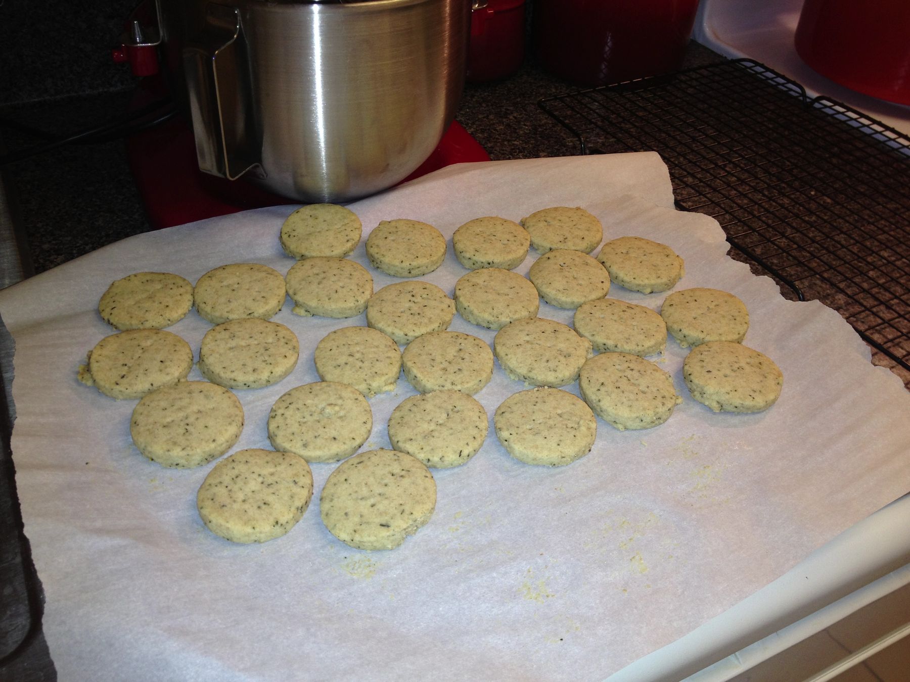 Roll out the dough to whatever thickness you wish. The thinner you roll them out, the crunchier they will be. The thicker they are, the softer they will be. When I roll out shortbread, I put the shortbread on a sheet of plastic wrap, flatten it out a little with my hands, and then put another sheet of plastic wrap on top of the shortbread. Then I use the rolling pin. This method makes sure that no extra flour gets worked into the surface of the shortbread. Cut them into any shape you want. I recommend a fairly small size. Place the cookies on the cookie sheet and bake for 15 minutes or until golden on the bottom. If it's been more than a couple of minutes more than that, and your cookies still don't have a golden brown bottom, pull them out. You don't want to overcook shortbread.
