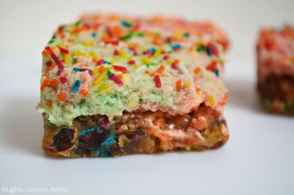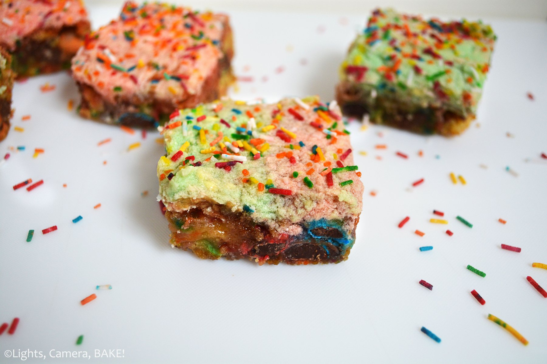 Soft, gooey and chewy cookie bars packed full of sprinkles, M&Ms and chocolate chips topped with a funfetti buttercream dyed a few colours just to make these really unicorn like.