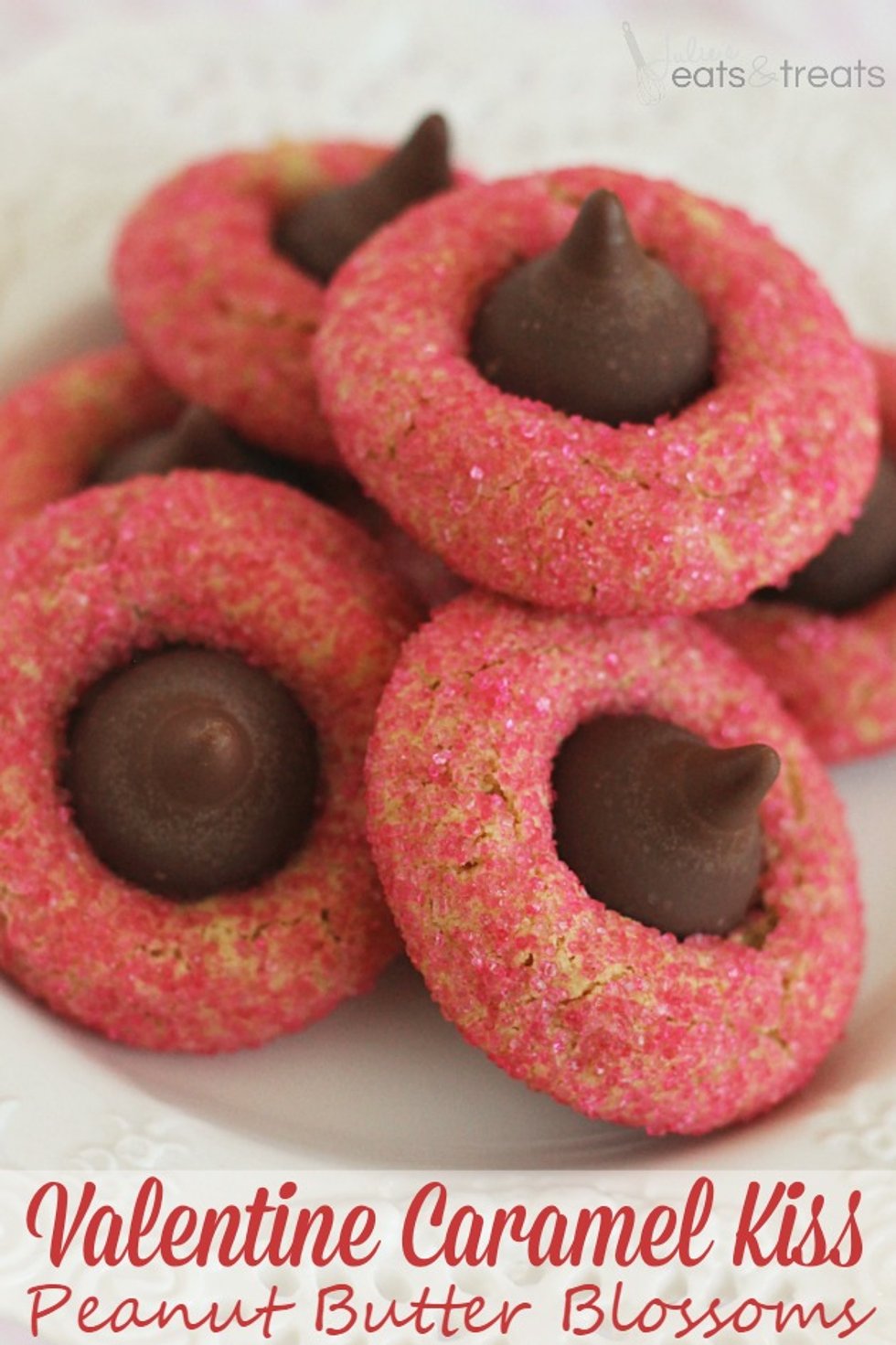 Valentine Caramel Kiss Peanut Butter Blossoms ~ Soft Peanut Butter Cookies with a Caramel Filled Kiss Rolled in Pink Sugar!