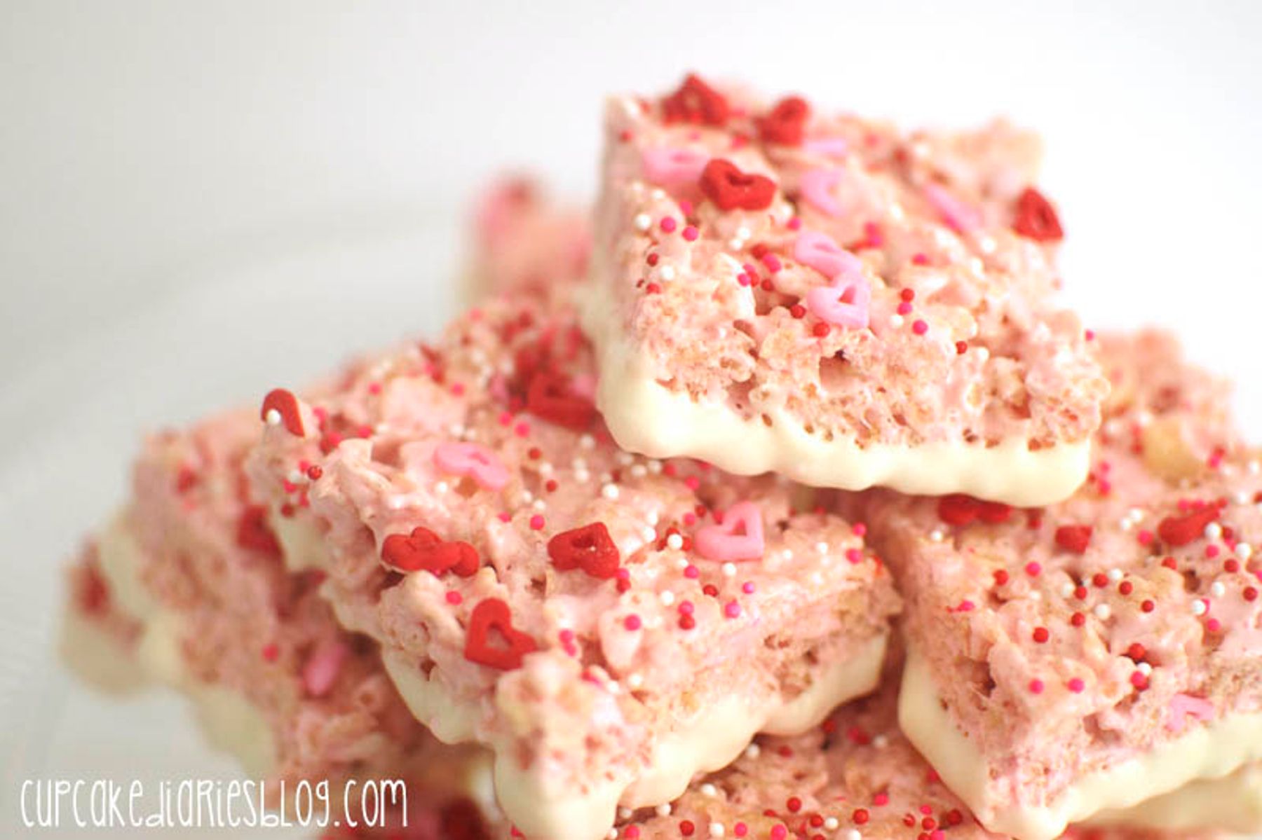 The chewiness of a classic rice krispy treat meets the subtle crunch of white chocolate with these Valentine's Day Krispy Treats! And the krispy treat itself has a hint of strawberry flavor!