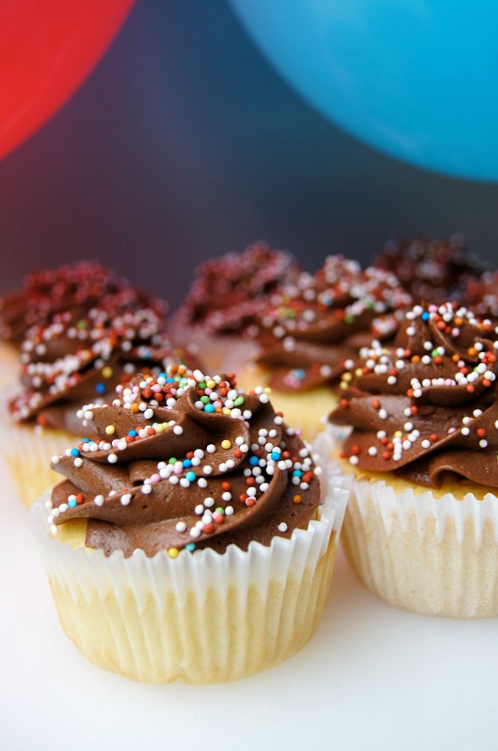 Homemade Vanilla Cupcakes with rich, chocolate frosting.