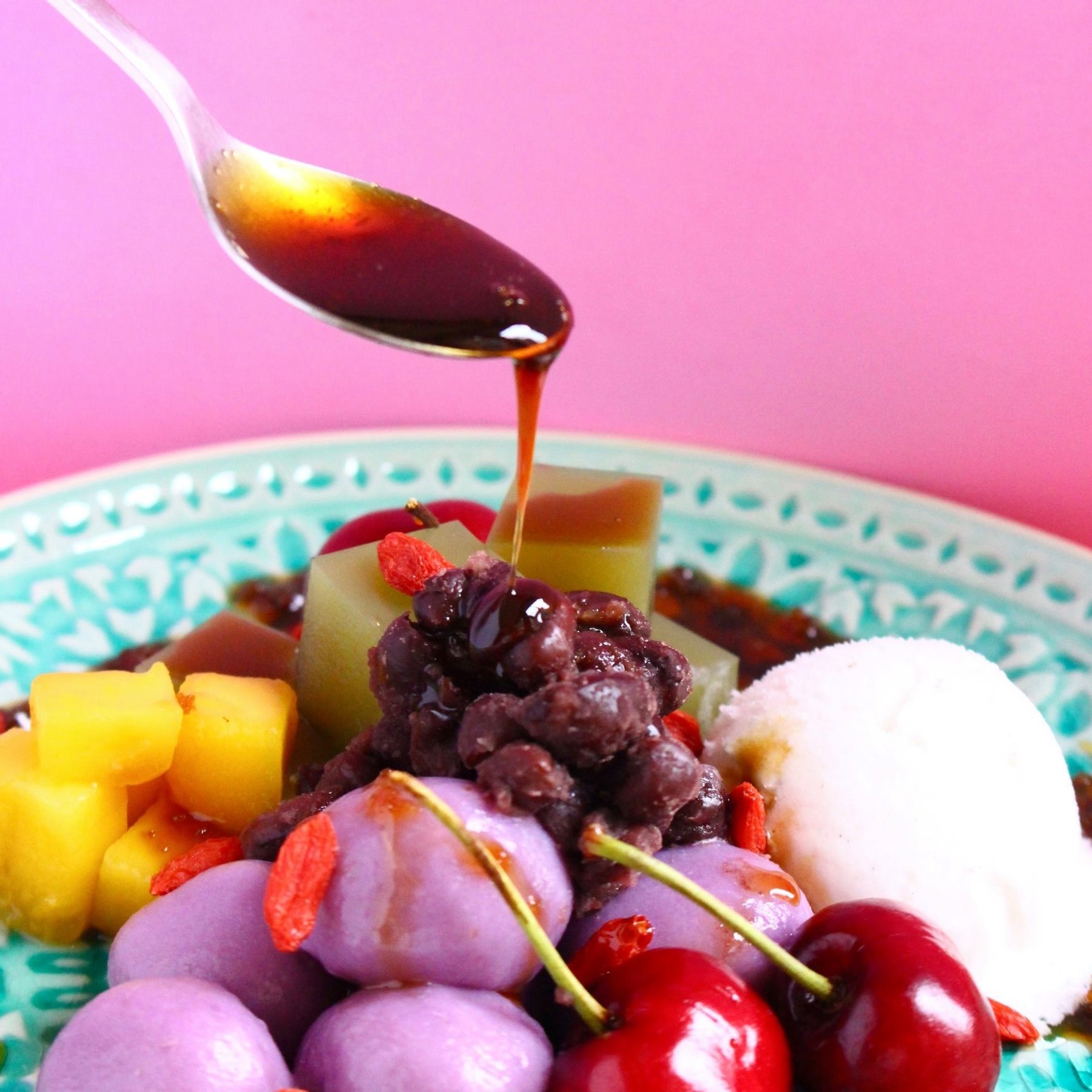 This Vegan Anmitsu is the perfect colourful and refreshing summer treat - cubes of green matcha jelly, pillows of purple sweet potato mochi and sweet red bean paste paired with vanilla ice cream, all topped off with some sticky date syrup. Gluten-free and refined sugar free.