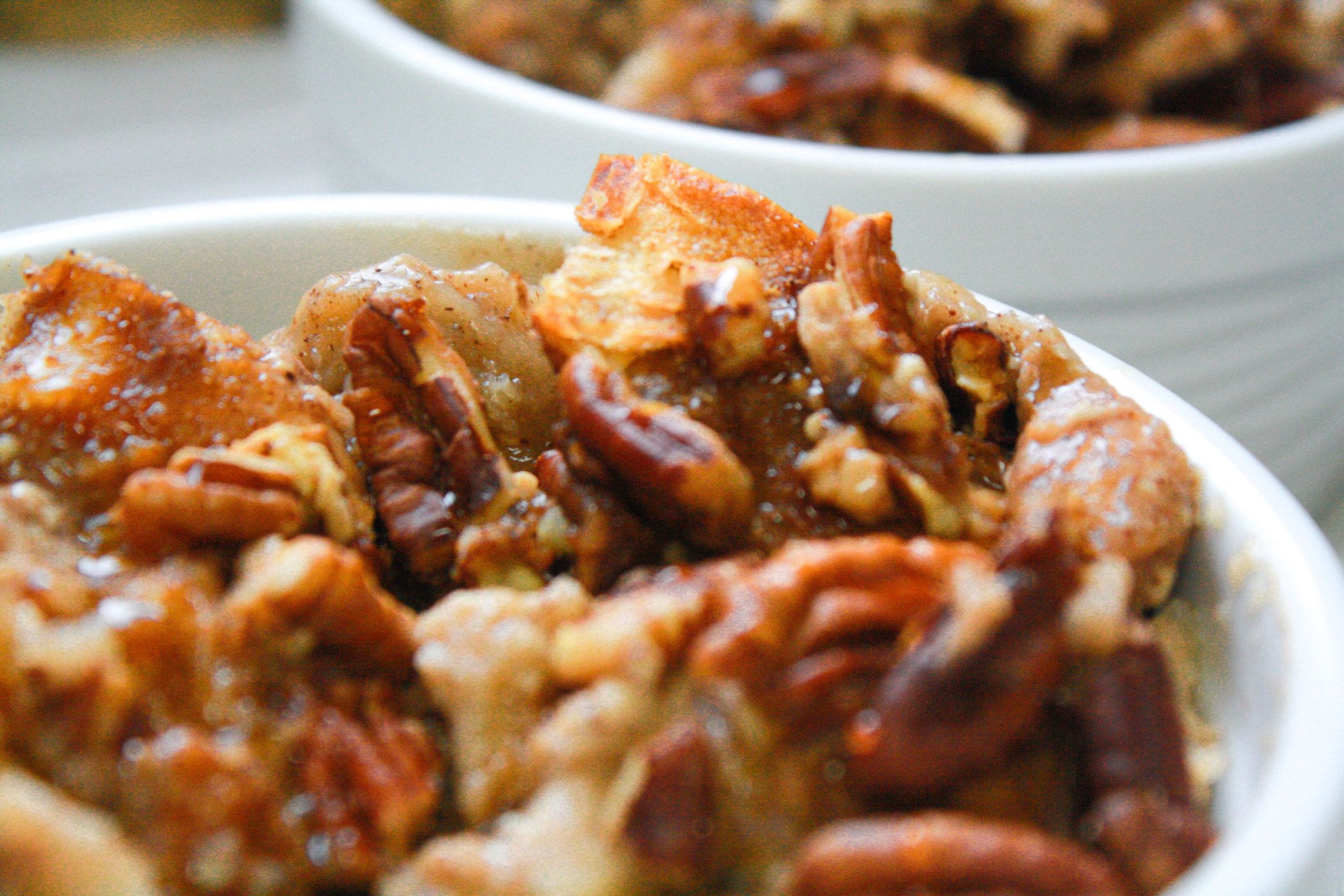 An easy approach to french toast, all vegan and baked in the oven! Warm, custardy and delicious with pecans, maple syrup and sourdough.