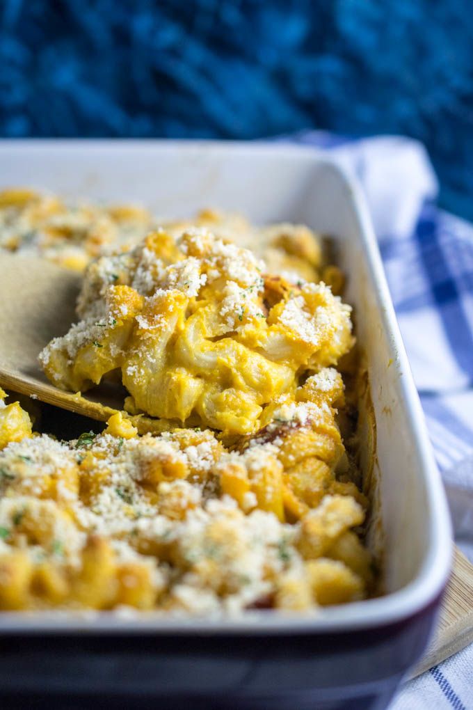 Prepare the mac and cheese sauce. Preheat the oven to 350 degrees F. Add the bell pepper whole to an oven safe baking dish. Slice the tops off of the cloves of the garlic, leaving the head intact;...
