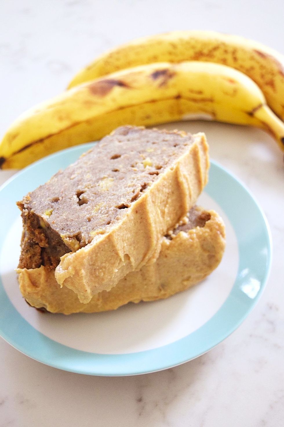 A classic sweet, soft banana bread topped with rich and tangy cream cheese frosting. Made with just a handful of healthy ingredients, gluten free. This vegan banana bread with cream cheese frosting is totally banana sweetened!