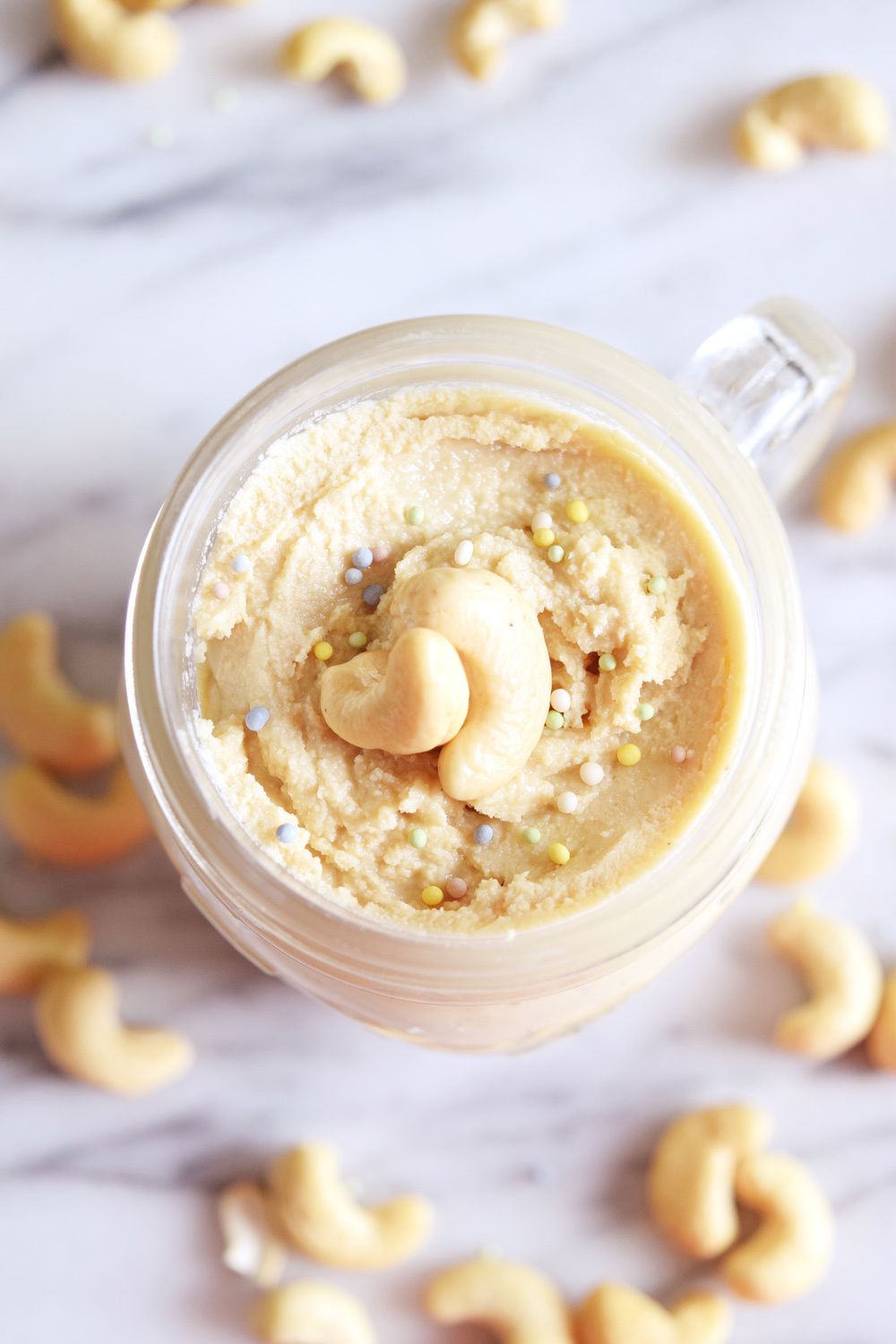 This cake batter cashew butter is so sweet and rich, it'll remind you of sweet cake frosting! Made with just 4 ingredients.