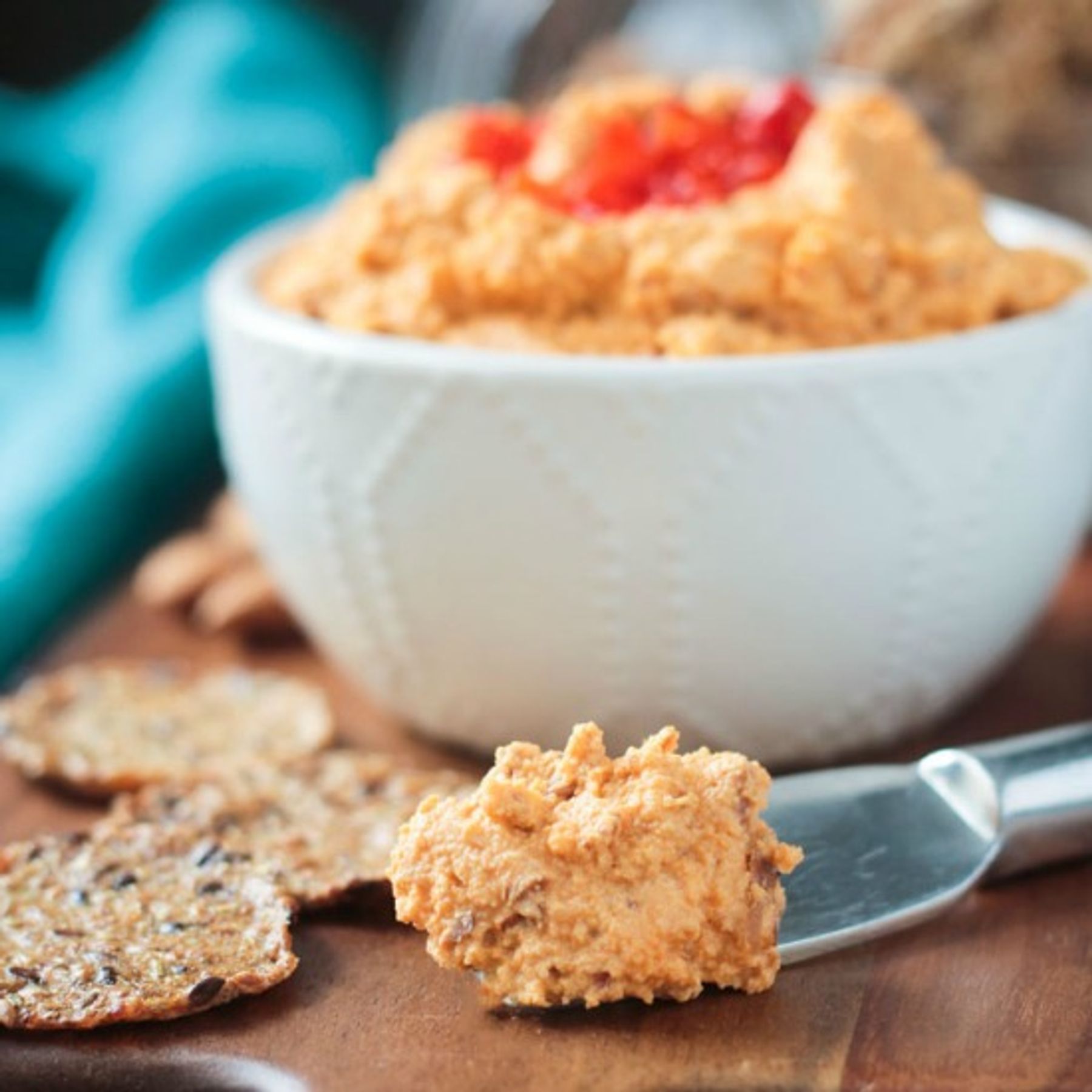 Drain the almonds. In the bowl of a food processor, lace the almonds, pimientos, nutritional yeast, salt,...