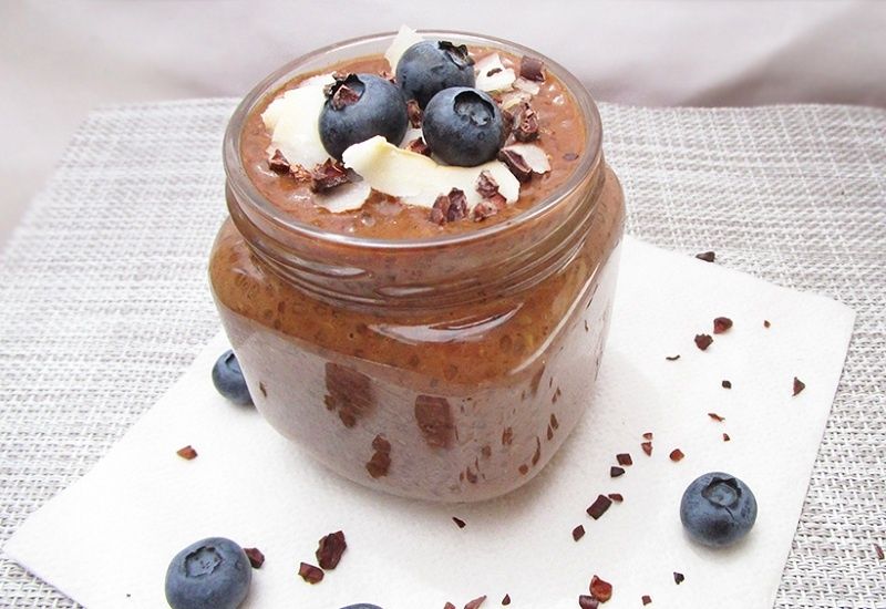 - Add chia seeds, cocoa powder, peanut butter, and maple syrup into a jar (or a small glass) and stir together until combined. Gradually add non-dairy milk constantly stirring. Tighten lid (or cover...