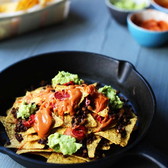 These vegan lentils nachos are easy to make with tortilla chips, lentils, a nacho dip, spicy tomato salsa and guacamole. Yum and ready in a flash.