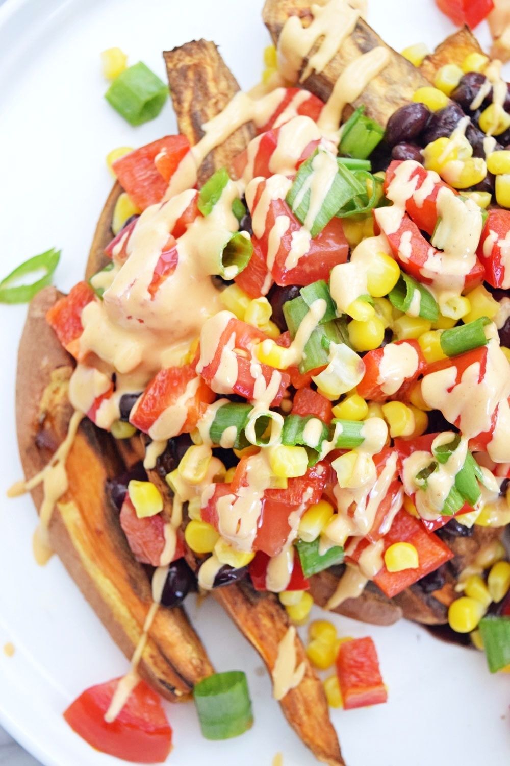 Vegan Loaded Sweet Potato Fries with Spicy Tahini Dip Sara GrandominicoAugust 02, 2019 210 Vegan loaded sweet potato fries with spicy tahini dip are super easy to throw together for a fun, satisfying, healthy meal!try itSee the full directions on my site