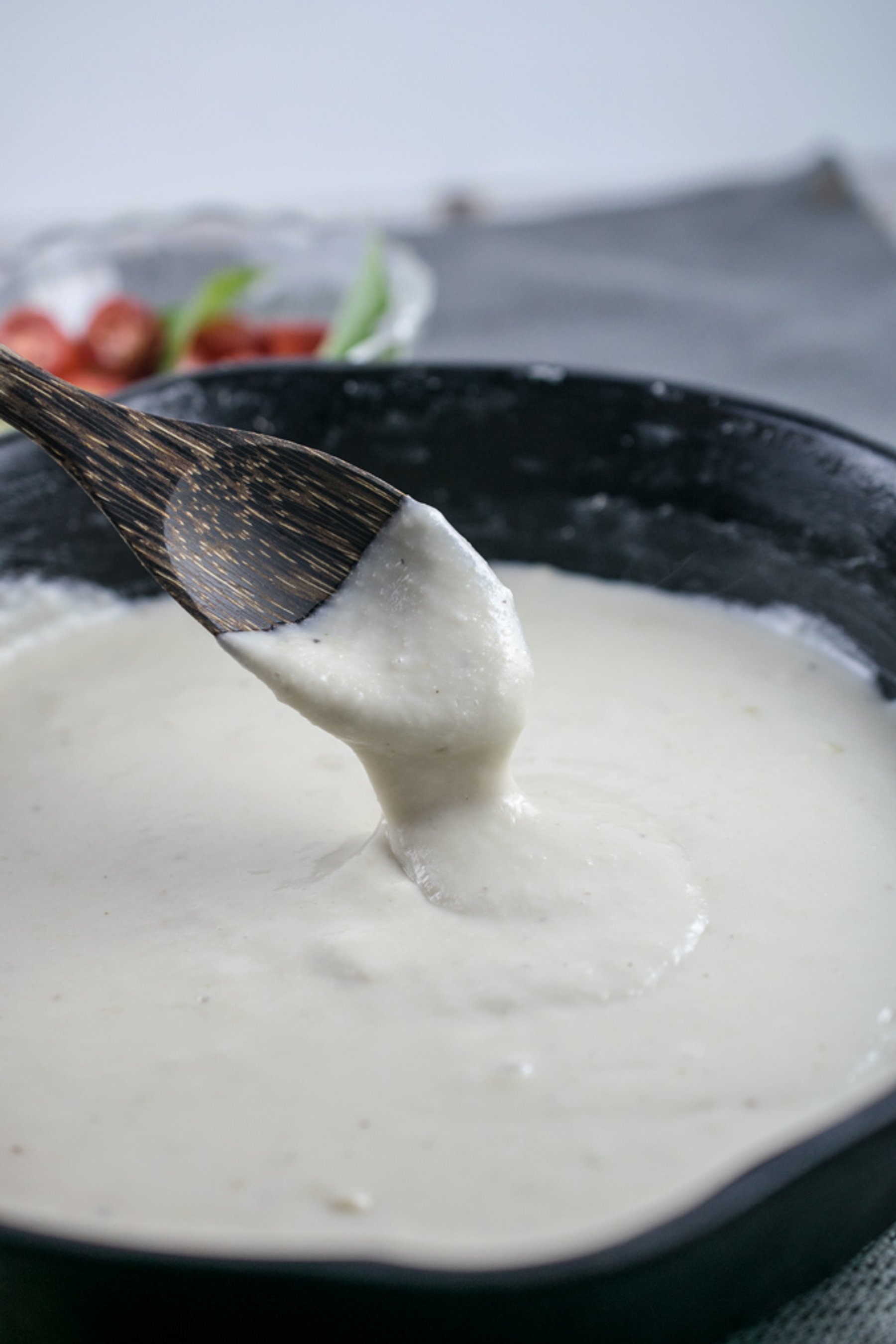 Stretchy gooey cashew-based dairy-free mozzarella.