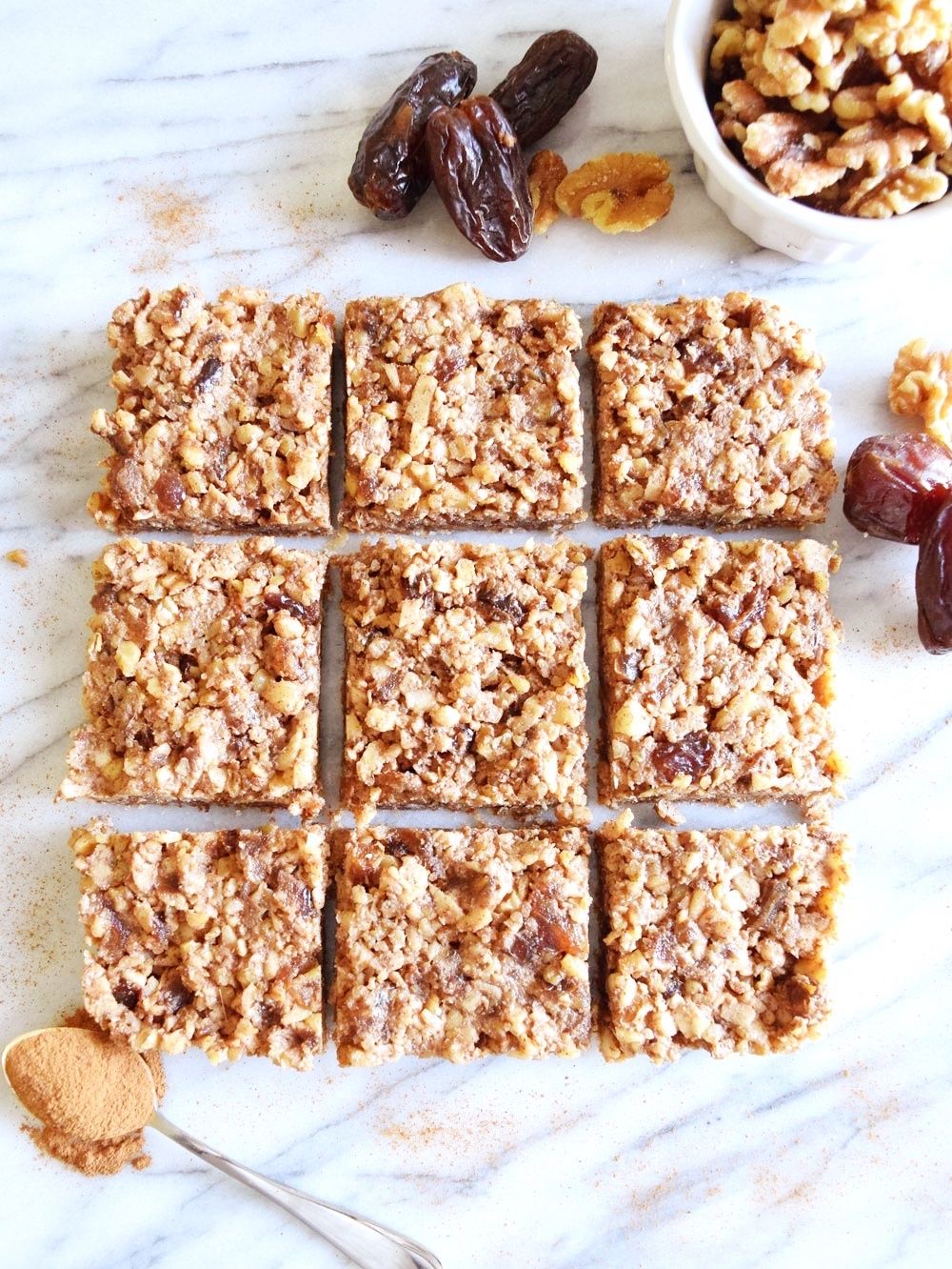 Vegan no bake apple crumb bars have a soft and sweet crust and a crunchy crumble topping. They're gluten free and fruit sweetened, and made with just 7 healthy ingredients, no oven required!